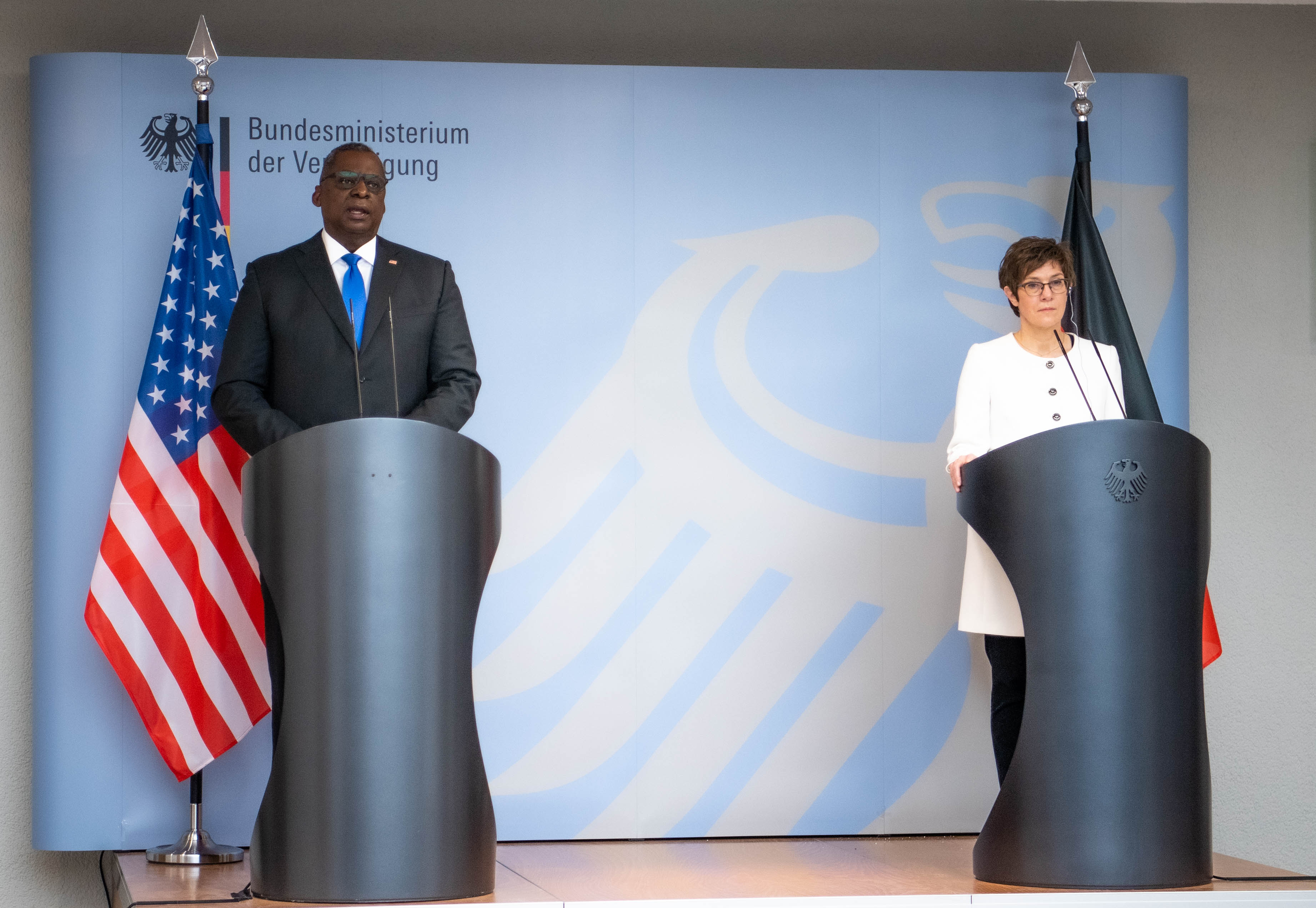 2021년 4월, 크람프카렌바우어는 러시아가 크림 반도와 서부 국경에서 병력을 증강하는 도발적인 행동을 취하고 있다고 비난하면서, 러시아가 2021년 3월에 시작된 수십 년 만에 유럽에서 가장 큰 나토 주도 군사 훈련 중 하나인 Defender-Europe 21이라는 대규모 NATO 주도 군사 훈련에 대응하는 것이라고 주장하는 것을 거부했다.[37][38][39]