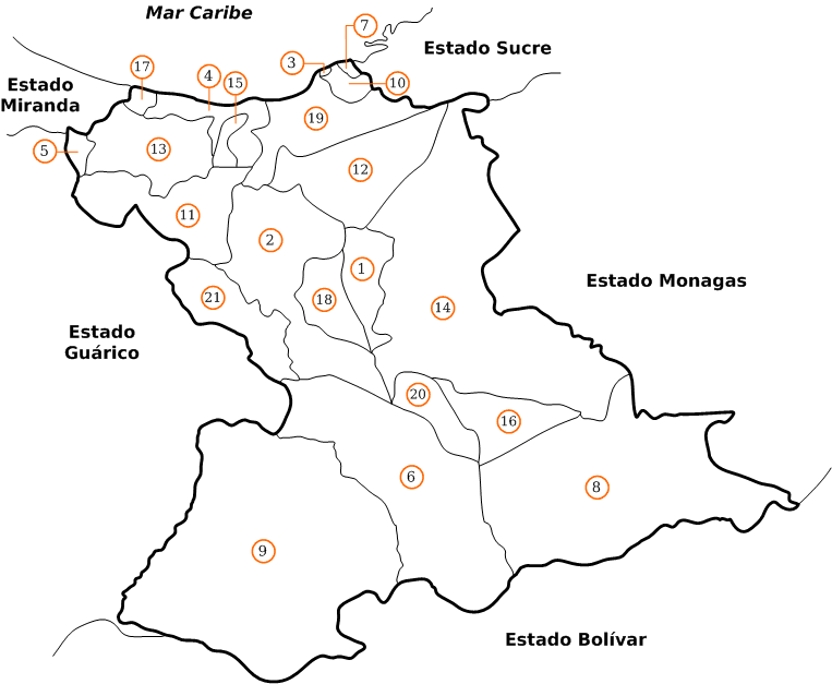안소아테기 주는 21개의 지방 자치체(municipios)로 구성되어 있으며, 각 자치체의 중심 도시는 괄호 안에 표시되어 있다.