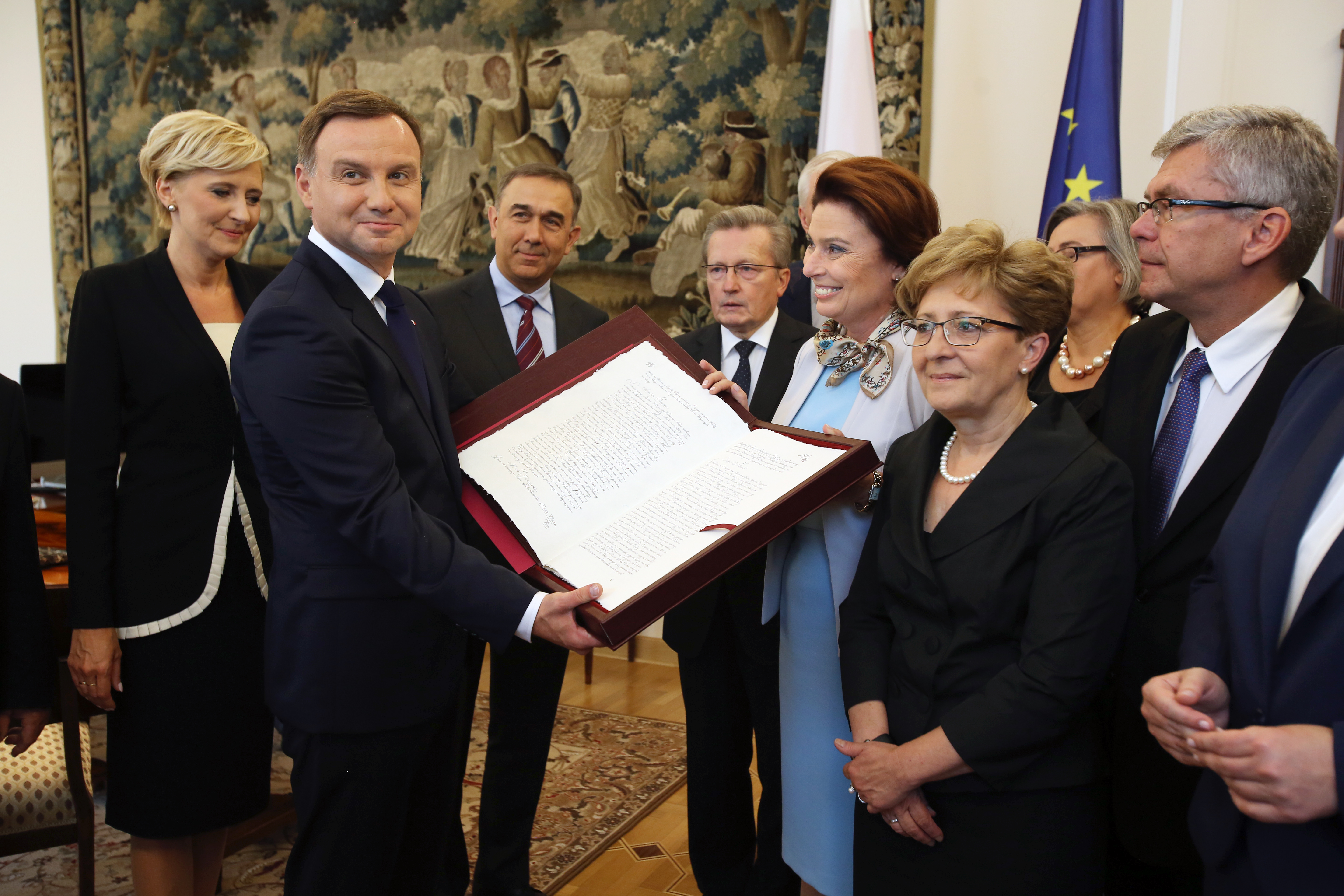 안제이 두다는 2015년 8월 6일 국민의회에서 취임 선서를 하며 대통령직을 시작했고,[18] 2020년 2020년 폴란드 대통령 선거에서 51.03%의 득표율로 재선되었다.[102]두다는 유럽 연합의 난민 신청자 재분배 정책에 반대했으며, 삼해 이니셔티브의 공동 창시자 중 한 명이다.[19][21] 총서기인 시진핑과 여러 차례 회담을 갖고,[22][23] 폴란드가 중국 일대일로 정책의 유럽 관문이 되기를 희망한다고 밝혔다.[24][26] 2017년 9월과 2018년 2월, 그의 지지율은 각각 71%, 72%였다.[27][28]