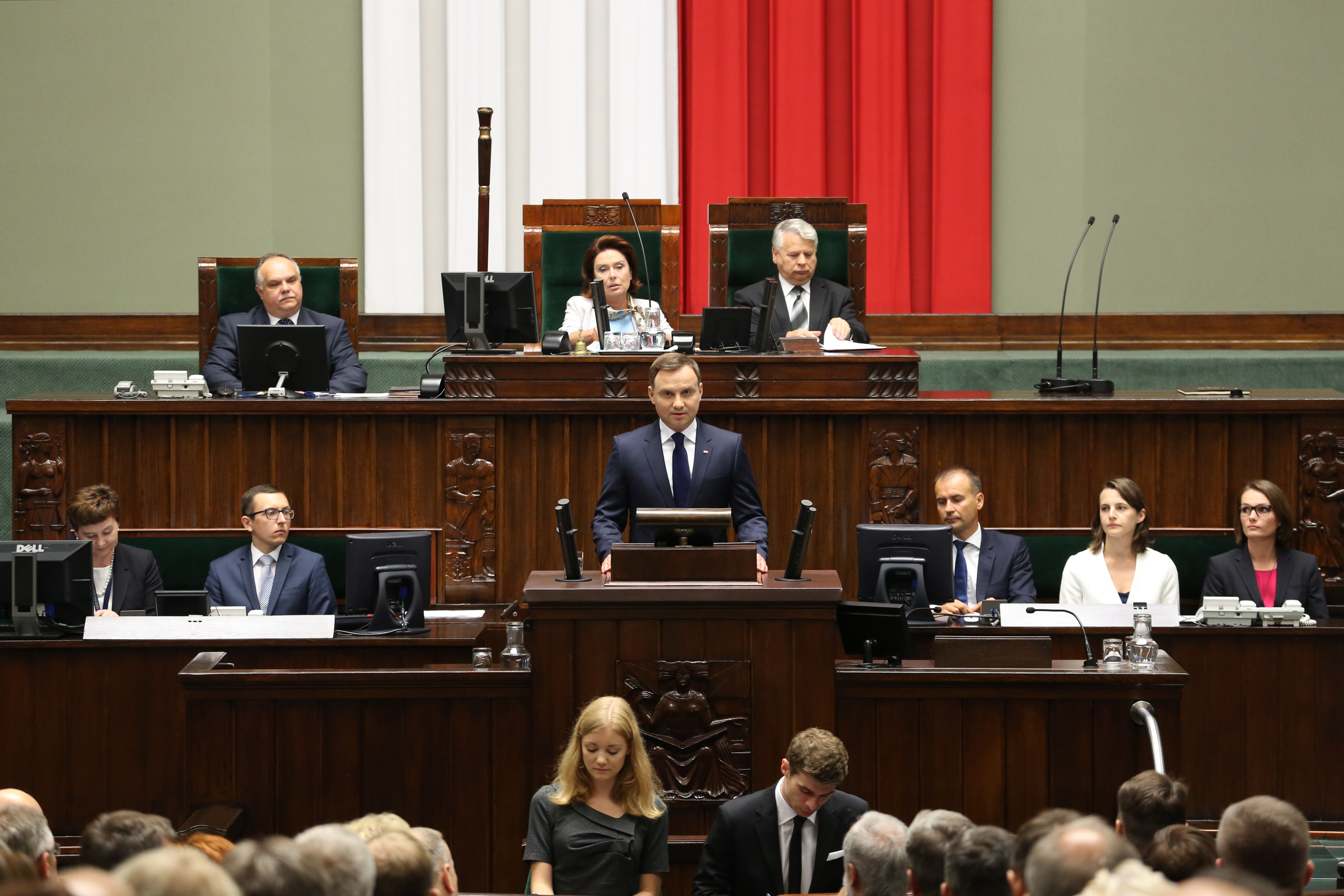 안제이 두다의 첫 5년 임기는 2015년 8월 6일 국민의회 회의에서 취임 선서를 함으로써 시작되었다.[18]두다는 유럽 연합이 제안한 난민 신청자 재분배를 위한 이주민 할당제를 거부하며 다음과 같이 말했다. "저는 강자의 지시에는 동의하지 않을 것입니다. 경제적 이점이 인구 규모에 달려 있으며, 다른 국가의 국가적 이익과 상관없이 해결책을 강요하는 유럽을 지지하지 않을 것입니다."[19]