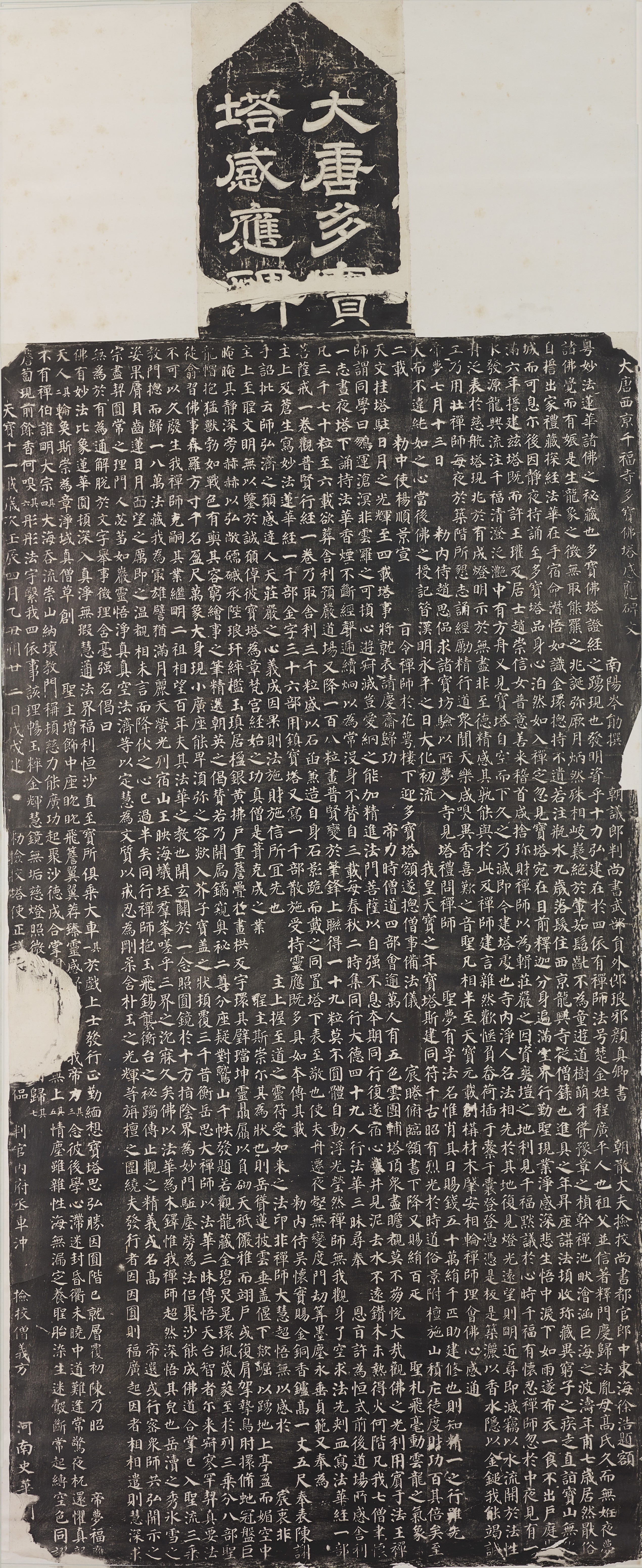 『다보탑비』는 752년에 건립되었으며, 서호의 예서 제액과 안진경의 해서 비문으로 구성되어 있다. 잠훈이 찬문하였으며, 초금이 천복사에 다보탑을 건립한 유래를 기록하고 있다. 현재 서안비림박물관에 있으며, 안진경의 초기 작품으로 해서의 모범으로 널리 사용된다.