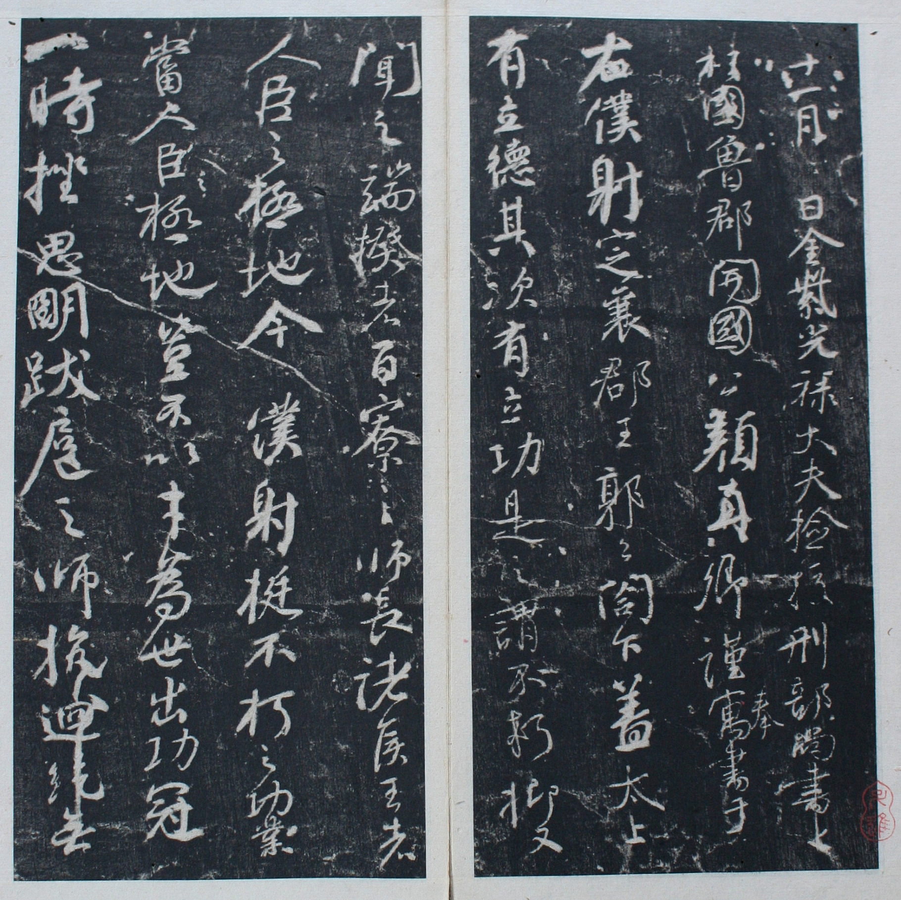 안진경은 50세에서 65세 사이에 ''곽가묘비''(郭傢廟碑)와 ''마고산선단기''(痲姑山仙墰記) 등 유명한 작품을 남겼다. 안록산의 난과 잦은 관직 변동을 겪으면서 그의 서체는 더욱 성숙해졌다. 붓을 휘두를 때 허리의 힘을 사용하고, 전서와 예서의 기법을 융합하여 붓획의 시작과 끝을 부드럽게 표현했다. "가로획은 가늘고 세로획은 굵게"라는 규칙을 따랐으며, 획의 굵기를 다양하게 하고 점과 사선 획은 날카롭게 마무리하여 곡선과 흐름을 살렸다. 자형(字形)은 방형(方形)을 이루며 절제된 배치를 보이고, 중앙은 넓고 외부 획은 촘촘하게 구성하여 전서와 예서의 형태를 띠었다. 글자는 세로로 촘촘하게 배치하고 행간(行間)에 여백을 두어, 초당(初唐) 서예의 화려함보다는 정직하고 힘찬 느낌을 주었다.