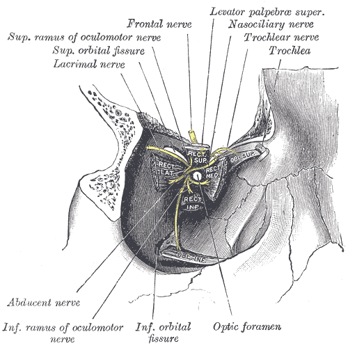 눈돌림신경(제3뇌신경)의 아래갈래가 안쪽곧은근을 지배한다.[11][2] 눈돌림신경은 안쪽곧은근을 따라가다 전체 길이의 2/5 정도 되는 지점에서 근육으로 들어간다.[11][2] 그 후 보통 2개의 작은 가지로 갈라지며, 간혹 3개로 갈라지기도 한다.[11][2] 이 가지들은 더 작게 나누어지며, 안쪽곧은근의 닿는곳보다 뒤쪽으로 17mm가량 떨어진 지점에서 표준 염색법으로는 감지할 수 없게 된다.[2]2. 2. 위치 관계