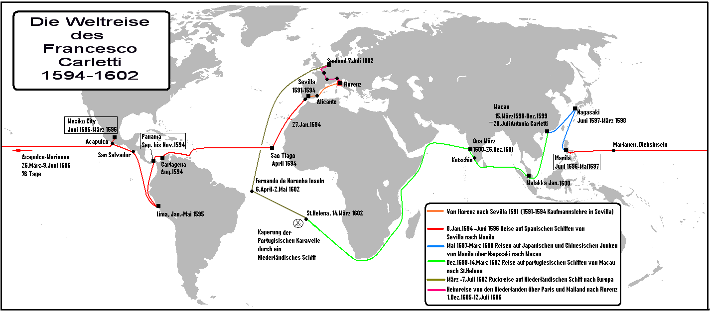 카를레티의 여행 지도. 코레아는 1598년 3월 나가사키를 출발하여 1602년 7월 젤란트에 도착하기까지 카를레티와 함께 여행했다.