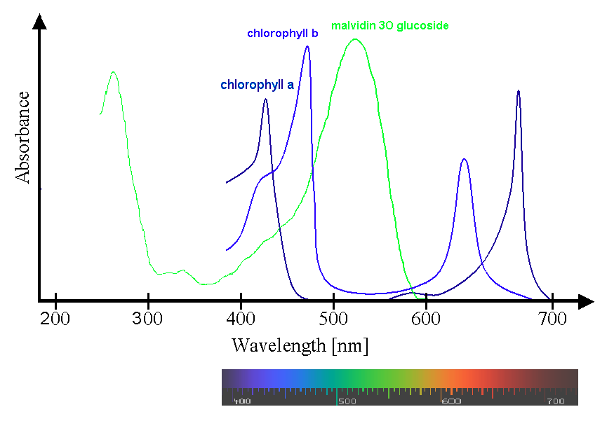 안토시아닌의 붉은색 흡수 패턴은 어린 ''Quercus coccifera'' 잎과 같은 광합성 활성 조직에서 녹색 엽록소와 상호 보완적인 관계를 가진다. 엽록소가 주로 청색과 황색/적색 빛을 흡수하는 반면, 안토시아닌(예: 오에닌)은 엽록소가 잘 흡수하지 못하는 녹색 영역의 빛을 흡수한다. 이러한 특성은 강한 빛으로부터 엽록소를 보호하는 역할을 할 수 있다. 또한, 붉은색은 녹색을 선호하는 초식 동물의 눈에 덜 띄게 하여 어린 잎을 보호하는 데 기여할 수도 있다.[6]