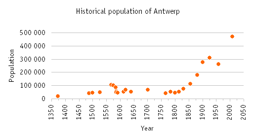 페르낭 브로델은 안트베르펜이 "브뤼헤가 전성기에도 이룬 적이 없는 ''전체'' 국제 경제의 중심"이 되었다고 평가한다.[25] 안트베르펜은 당시 유럽에서 가장 높은 성장률과 가장 부유한 도시였다.[26][20] 황금기는 "탐험 시대"와 밀접하게 관련되어 있으며, 16세기 초 안트베르펜은 알프스 북쪽에서 두 번째로 큰 유럽 도시로 성장했다.