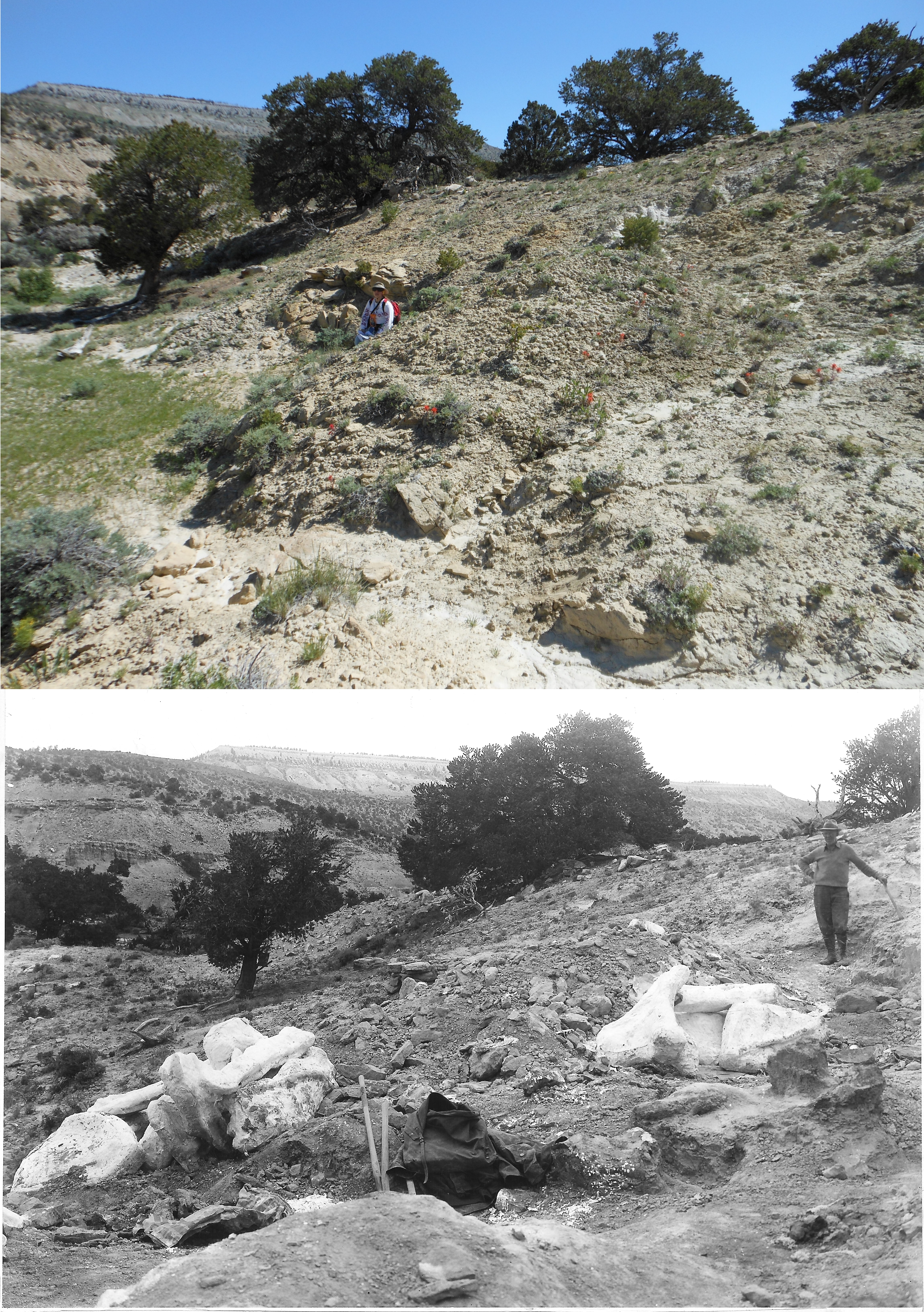 1921년, 뉴멕시코주샌환에 있는 오호알라모 지층의 일부인 배럴 스프링스 아로요(Barrel Springs Arroyo)에서 여러 부분적인 화석이 발견되어, 1922년 "USNM 10486" 및 "USNM 10487"의 분류 번호가 붙여졌다. 1946년에는 1937년6월 15일에 유타주에머리 군의 노스 혼 산(North Horn Mountain)에서 발견된 더 완전한 화석에 "USNM 15660"의 분류 번호가 붙여졌다. 유타주나 텍사스주에서도 화석이 발굴되고 있지만, 같은 종이지만 크기가 다른 것들이 발견되었으며, 이것들은 어린 개체나 나이가 어린 개체로 추정되고 있다. 지금까지 발견된 것은 모두 부분 골격으로, 완전 골격은 미발견이다. 이빨 화석이 부분적으로 발견되었지만, 완전한 상태의 두개골은 발견되지 않았다.