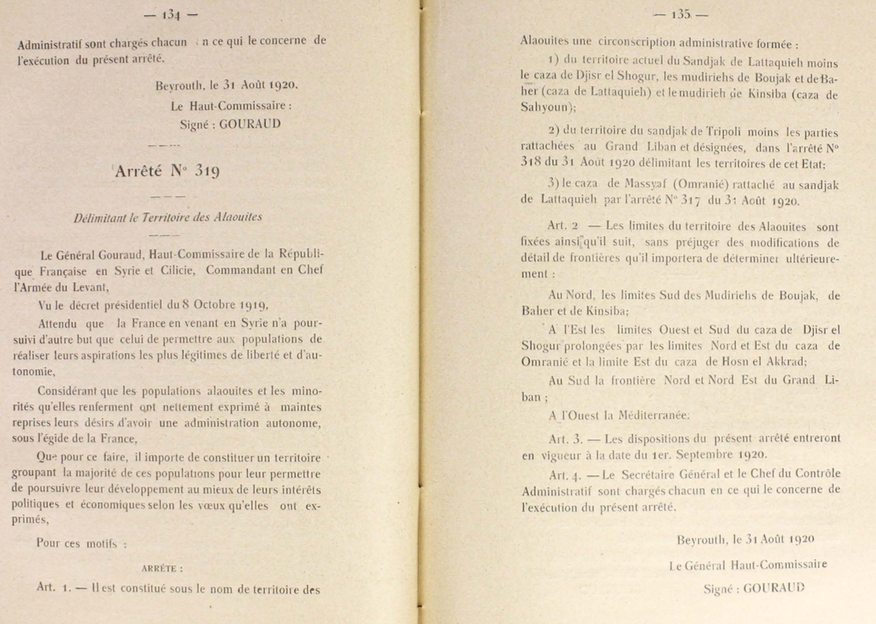 1920년 9월 2일, 알라위 마을을 포함하는 해안 및 산악 지역에 "알라위 영토"가 창설되었다. 프랑스는 산악 거주민의 "후진성"을 인용하여 이러한 분리를 정당화했는데, 그들은 주변 수니파 인구와 종교적으로 달랐다. 이 분할은 알라위인을 더 강력한 다수로부터 보호하려는 의도였다.
