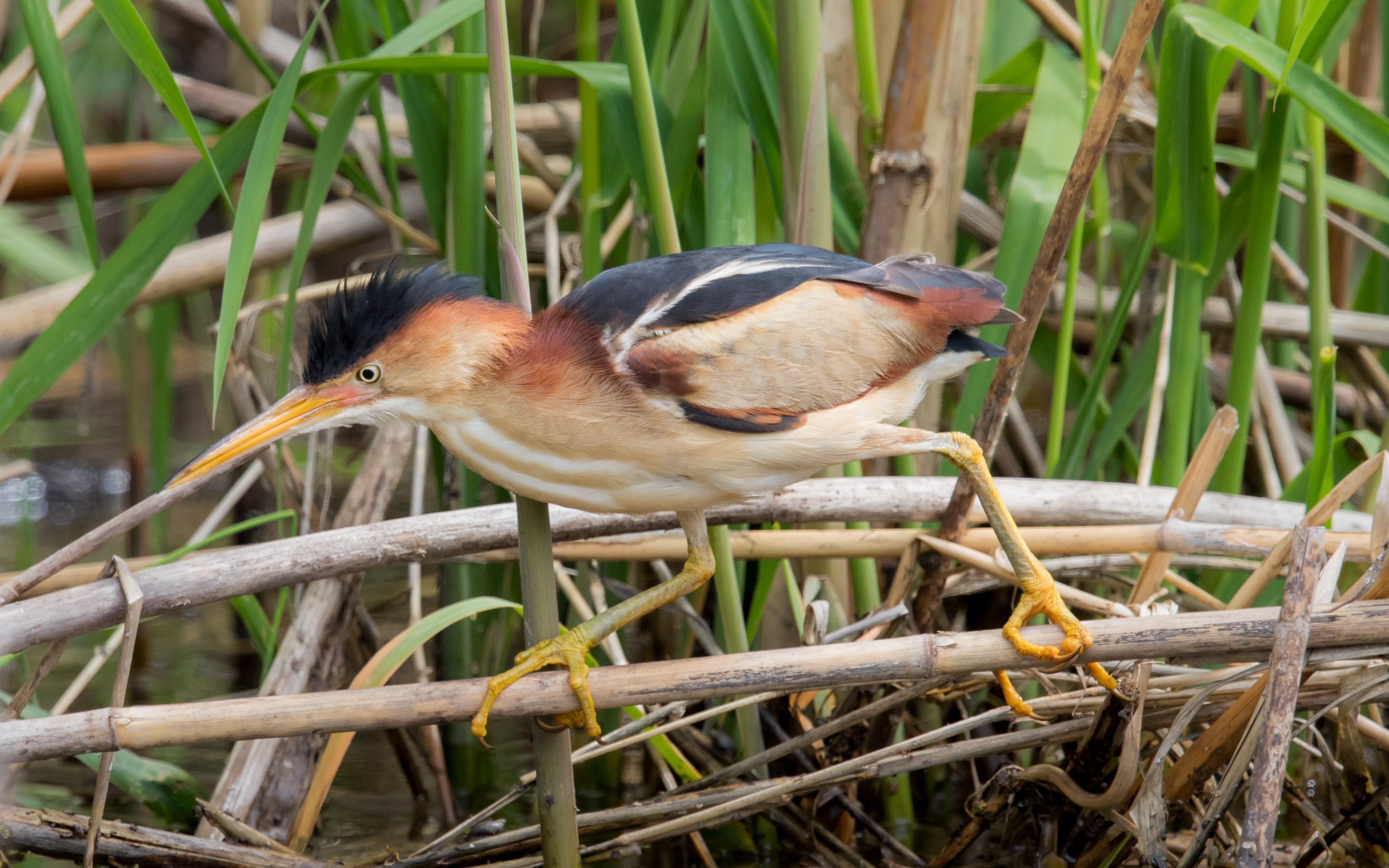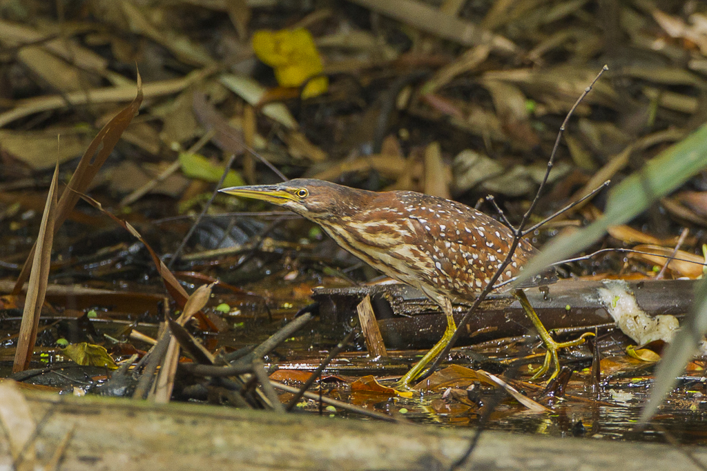 알락해오라기는 큰 덩치에 갈색 줄무늬가 뚜렷한 새이며, 넓은 갈대밭에서 번식한다. 포식성 조류 중 거의 유일하게 암컷 혼자 새끼를 키운다.[10] 이들은 은밀하고 위장이 잘 되어 있으며, 크기에도 불구하고 가끔 나는 모습을 제외하고는 관찰하기 어렵다. 물고기, 개구리 및 유사한 수생 생물을 먹는다.[11]