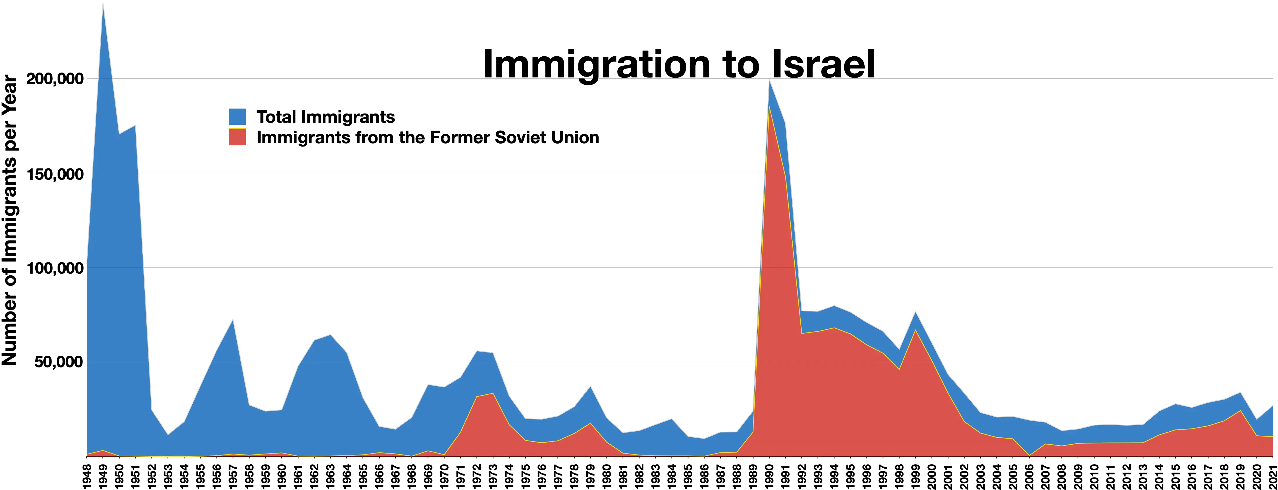 1980년대 후반 미하일 고르바초프 소련 공산당 서기장의 개방 정책과 1991년 소련 붕괴 이후, 약 100만 명의 구소련 출신 사람들이 이스라엘로 이주했다.[55] 2014년 러시아-우크라이나 전쟁 발발 이후, 우크라이나에서 이스라엘로 이주하는 우크라이나 유대인의 수가 급증했다.[57][58] 2022년 러시아의 우크라이나 침공 이후에는 "이민자들이 고향으로 돌아온다" 작전이 발표되어, 2022년 6월 현재 25,000명 이상의 사람들이 우크라이나, 러시아, 벨라루스, 몰도바에서 이스라엘에 도착했다.[67]