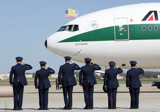 로마 교황 탑승기에 경례하는 미국군병사