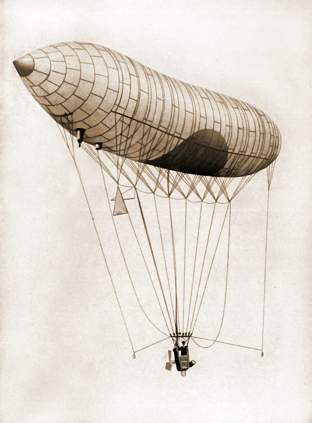 산토스 뒤몽이 설계한 최초의 비행선인 1호는 길이 25미터, 부피 186입방미터였다.[46] 1898년 9월 18일 파리의 불로뉴 숲에서 다시 팽창되었지만, 로프를 잡고 있던 지상 승무원의 판단 착오로 인해 비행 전에 손상되었다. 이틀 후에 수리된 항공기는 이륙하여 비행했다. 외피를 튼튼하게 유지하는 내부 풍선의 공기 펌프가 제대로 작동하지 않았고,[24] 400미터 높이에서 비행선이 구부러지기 시작하여 급격히 하강했다.[46]