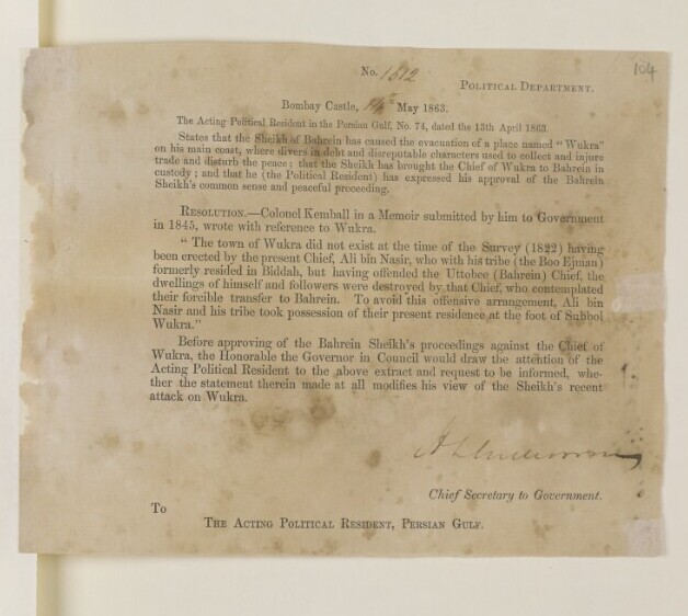 1863년, 바레인 통치자 무함마드 빈 칼리파는 사촌 무함마드 빈 아흐메드를 카타르 부 에미르로 파견했다. 카타르인들은 그가 알와크라 통치자를 체포하여 바레인으로 추방하고, 도시의 다른 유력자들을 바레인으로 추방한 후 곧 바레인으로 돌려보냈다. 이 사건은 1863년 4월 13일자 파견에서 임시 정치 거주자에 의해 보고되었으며, 추방 이유는 채무자들과 이 지역의 무역과 평화를 해치는 불량한 인물들의 은신처를 제거하기 위함이었다.[13]