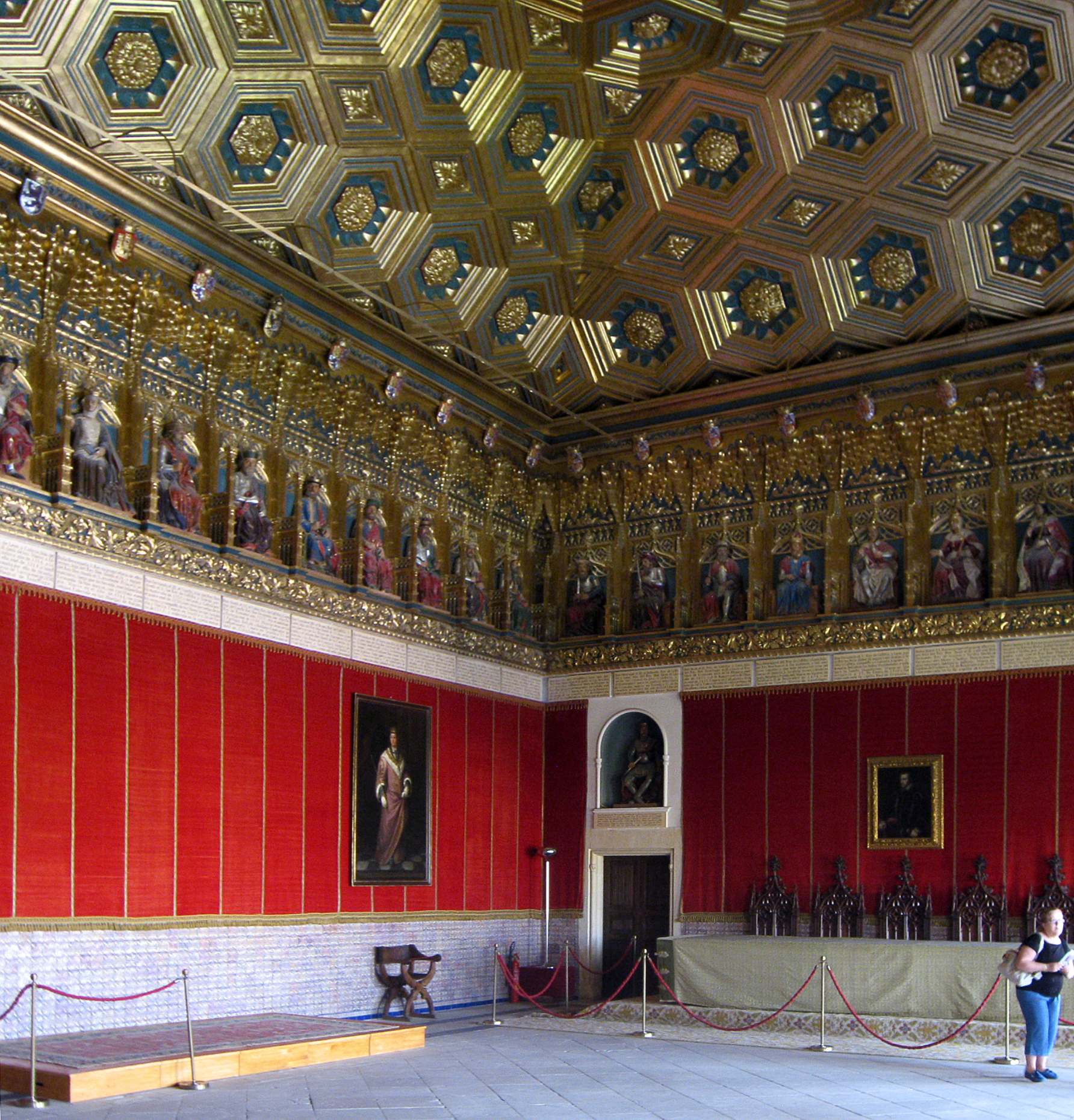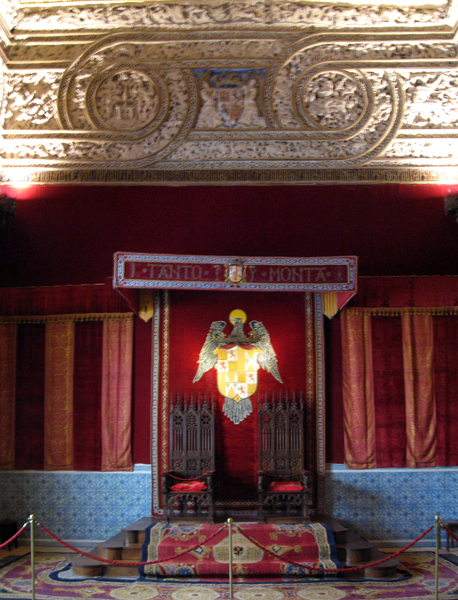 - 왕좌의 방: 벽에는 여러 왕들의 초상화가 걸려 있으며, 스페인(이사벨 2세 여왕)이 의뢰한 왕들의 컬렉션의 일부이다. 카스티야(이사벨 1세)의 초상화는 마드라소가, 아라곤(페르난도 2세)의 초상화는 몬타녜스가 서명했다.[10] 14세기부터 현존하는 문서에서 "''레이 엔 시엘라''" (왕이 왕좌에 앉아 있는; 즉위한 왕)라고 언급되었다. 외국 대사 접견, 연회, 음악 공연, 문학 행사 등 다양한 정치적 의식에 사용되었다.[10]