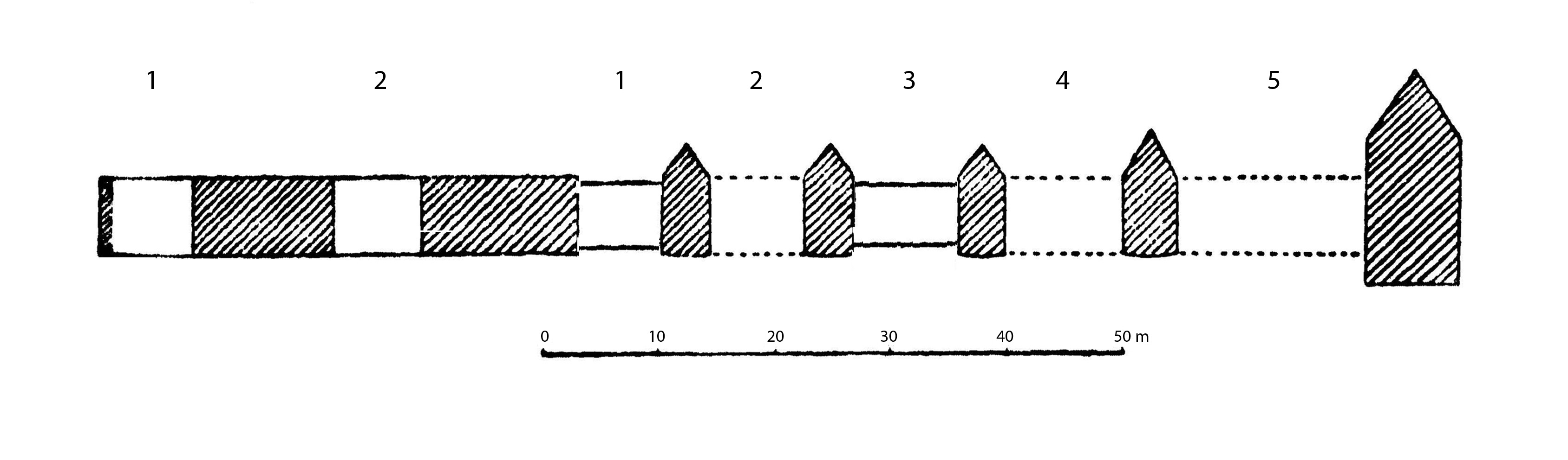 경사로 진입부의 길이는 42m이고 너비는 6.55m 에서 6.8m이다.[24] 경사로에 있는 결원아치 두 개의 경간은 각각 6.95m와 7.4m이며,[24] 경간 대 높이 비율(span-to-rise ratio)은 각각 4.0:1과 3.3:1에 해당한다.[28] 아치 받침 부분(스프링잉, springing)의 경사진 접촉면이 정교하게 맞춰져 있어 이 아치들이 로마 시대에 만들어졌음을 명확히 보여준다.[29] 아치를 구성하는 홍예석(voussoir)의 두께는 1.2m로, 아치 경간에 비해 상당히 두꺼워 보인다 (각각 아치의 세장비는 1:5.8과 1:6.2).[24] 반면, 현재 남아있는 아치 1번과 3번은 후대에 부주의하게 쌓인 잡석으로 만들어진 불안정한 대체물이다.[30] 이 아치들의 정확한 건축 시기는 다른 수리 부분들과 마찬가지로 알려져 있지 않으나, 성전 기사단 시대에 이루어졌을 가능성이 있다.[17]