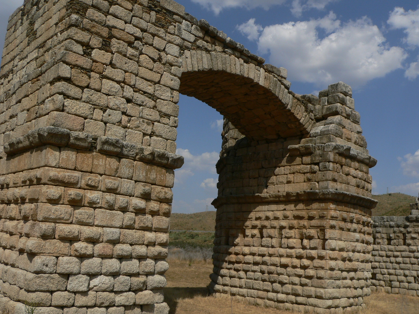 알칸타라 다리는 루시타니아 속주 시대에 건설되어 전쟁으로 파괴된 후 재건되었으며, 현재 181.7m 길이의 6개 아치로 구성되었고 로마 비문과 설계자를 기리는 신전이 존재한다.