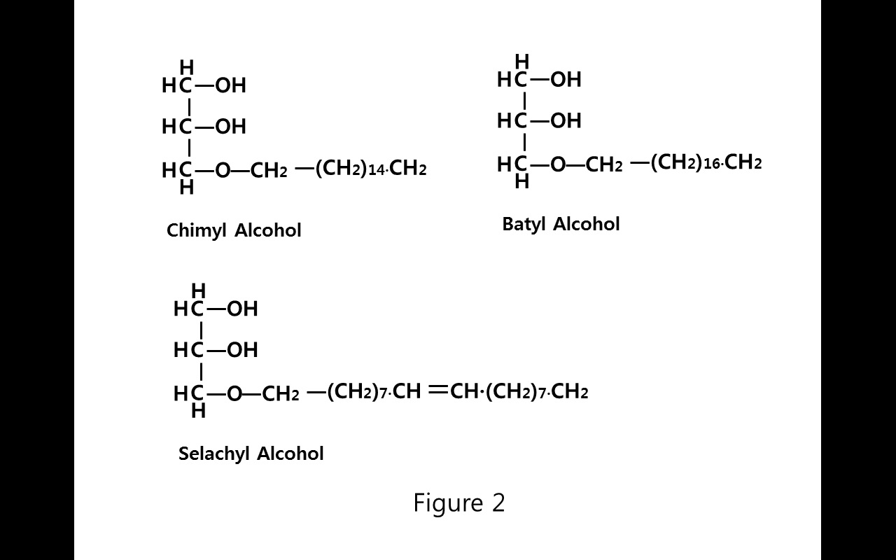 알콕시글리세롤은 글리세롤 골격에 지방산 대신 알킬기가 에테르 결합으로 연결된 구조를 가지며, 바틸 알코올, 키밀 알코올, 셀라킬 알코올 등이 주요 성분이다.[41]