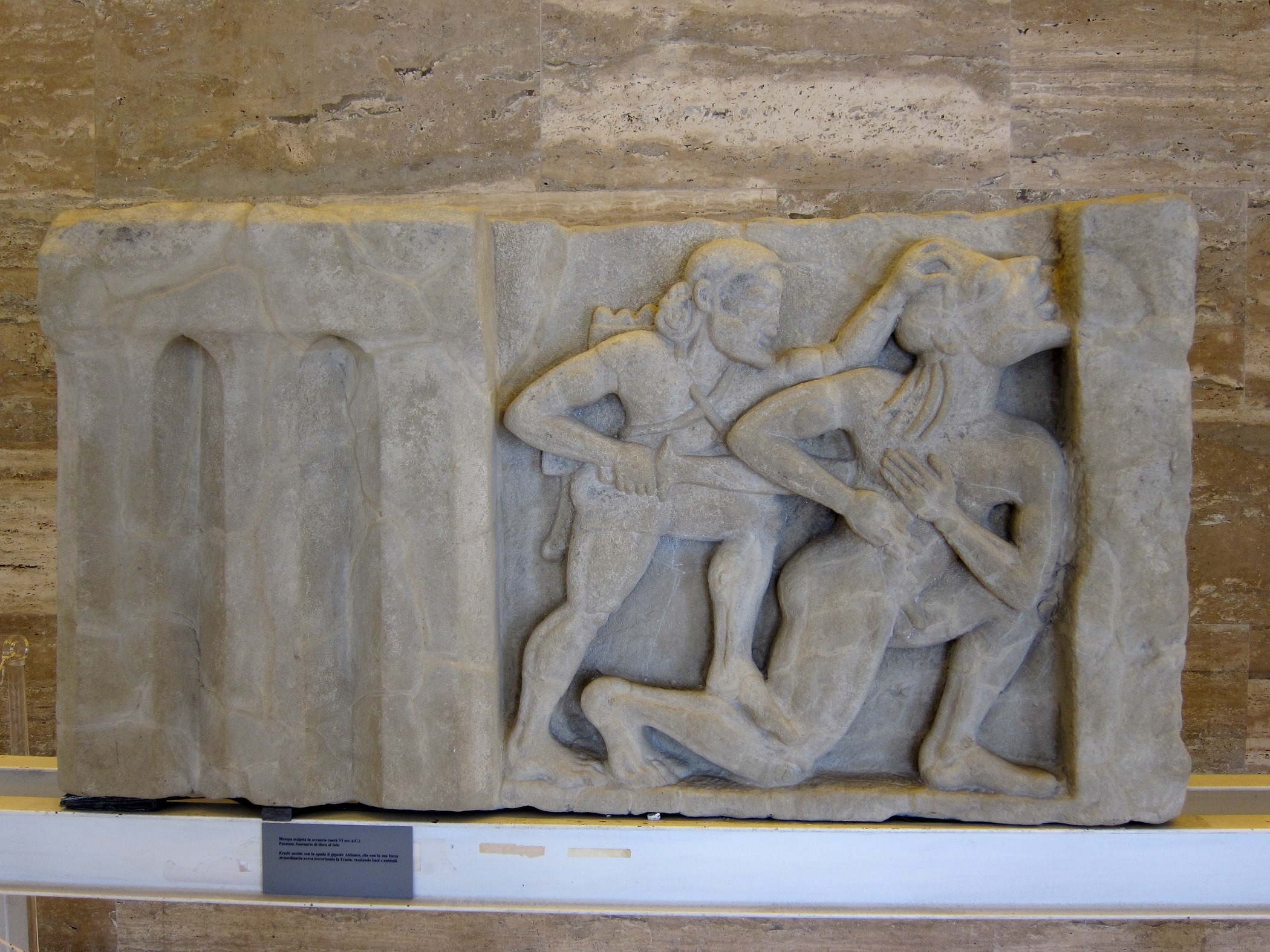 헤라클레스와 알키오네우스의 전투는 기원전 6세기 항아리 그림 등에서 명문으로 확인된다. (예: 루브르 F208)[1] 이 전투를 묘사한 가장 오래된 예시는 포세 델 셀레의 헤라 신전 메토페로 추정된다.[1] 이 메토페에는 헤라클레스가 알키오네우스의 머리카락을 잡고 칼로 찌르는 모습이 묘사되어 있다.[1] 같은 장면은 올림피아의 여러 방패 밴드 부조(B 1801, B 1010)에서도 묘사된다.[1]