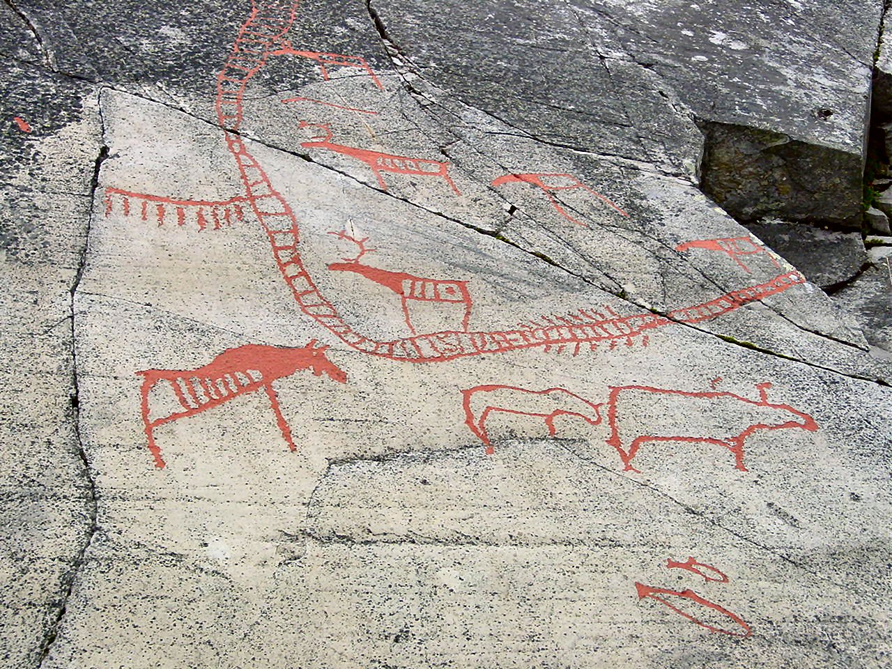 해안선의 융기로 인해 제작 시기가 오래된 것일수록 높은 위치에, 새로운 것일수록 낮은 위치에 그려져 있다.[5] 주요 모티브는 순록, 무스, 곰 등 북극권에 서식하는 동물들과 이를 사냥하는 사람들, 배를 타고 고기를 잡는 사람들 등이다.
