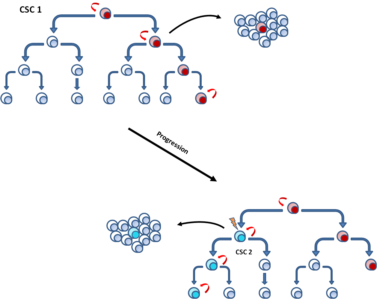 이 두 모델은 서로 배타적이지 않다. 암 줄기세포 자체가 클론 진화를 겪을 수 있기 때문이다. 예를 들어, 특정 돌연변이가 암 줄기세포에 더 공격적인 특성을 부여하면, 이 변이된 암 줄기세포가 선택적으로 증식하여 이차적으로 우세한 암 줄기세포 클론이 발생할 수 있다(그림 5).[161]