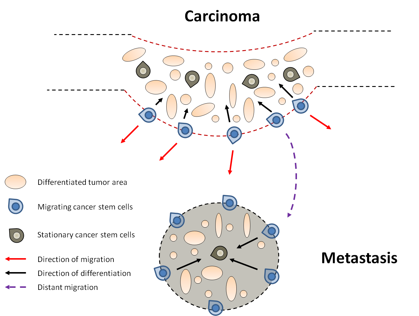 암 줄기세포 모델은 종양 내의 특정 세포 집단, 즉 암 줄기세포만이 스스로를 복제하는 자기 재생 능력과 다양한 종류의 종양 세포를 만들어내는 다분화능을 가지고 있어 종양 전체를 형성하고 유지한다고 설명한다.[157] 이 모델에서 암 줄기세포는 종양 세포 계층의 최상위에 위치한다.[158]