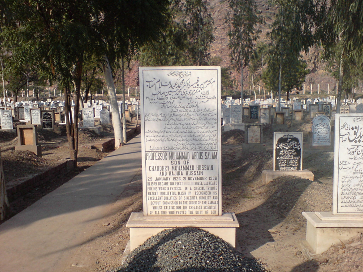 압두스 살람은 1996년 11월 21일, 70세의 나이로 잉글랜드 옥스퍼드에서 진행성 핵상 마비로 사망했다.[105] 그의 시신은 파키스탄으로 돌아와 다룰 지야팟에 안치되었고, 약 1만 3천 명의 사람들이 조문했으며, 장례 기도에는 약 3만 명이 참석했다.[106]살람은 파키스탄 펀자브 주 라브와에 있는 바히슈티 마크바라 묘지에 묻혔다. 그의 묘비에는 처음에 "최초의 무슬림 노벨상 수상자"라고 적혀 있었으나, 파키스탄 정부는 아마디야 무슬림을 비무슬림으로 공식 선언한 유일한 국가로서 "무슬림"이라는 단어를 삭제했다.[107] "무슬림"이라는 단어는 지역 판사의 명령으로 가려졌다가 국가 차원으로 확대되었다.[108] 이는 1984년 제정된 20조례[109][110]와 파키스탄 헌법 제2차 수정안[111]에 따른 것이다.