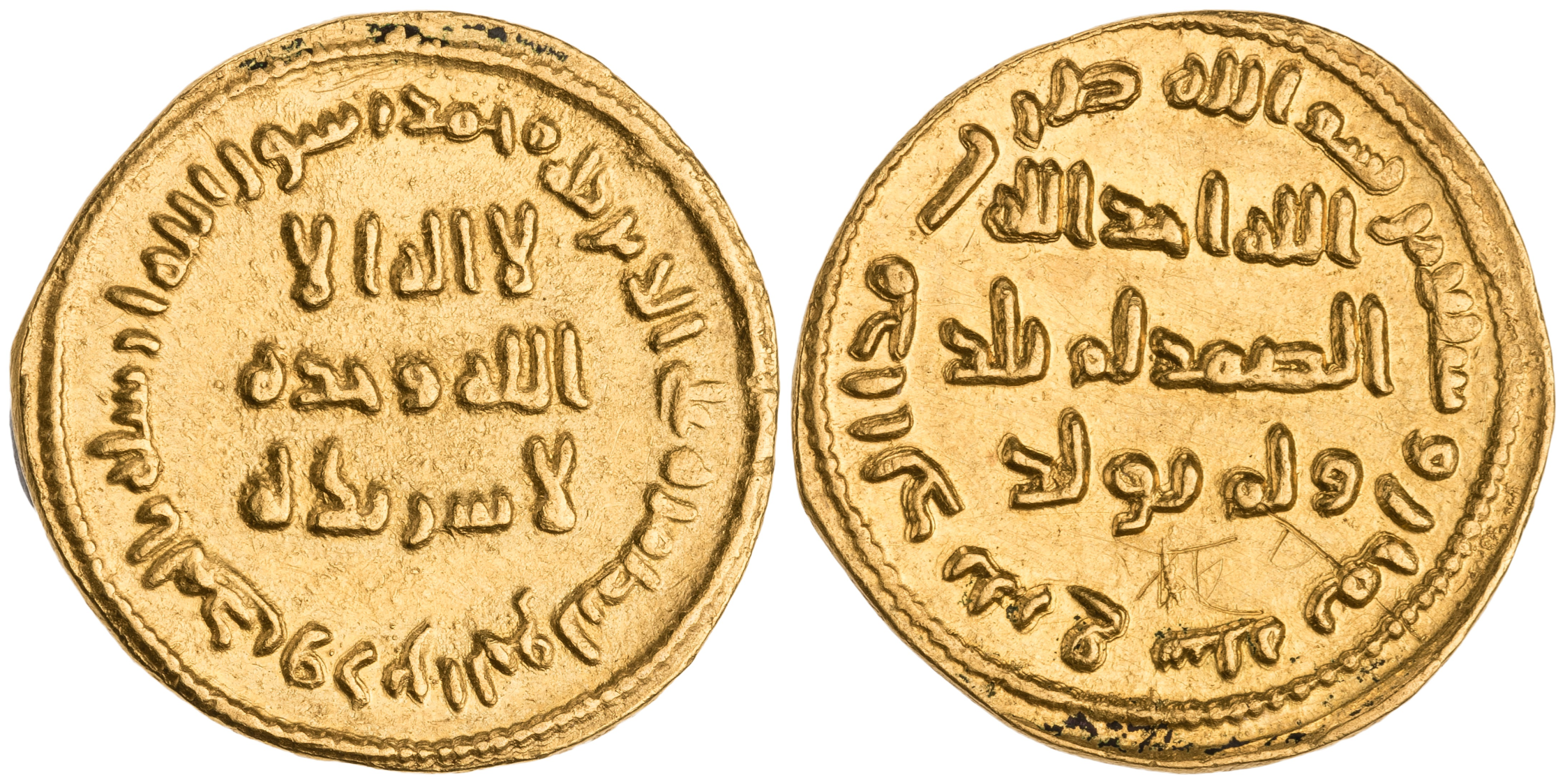 히즈라력 78년(서기 697/8년)에 다마스쿠스에서 주조된 압드 알말리크의 디나르 금화. 압드 알말리크는 693년에 독자적인 이슬람 통화를 도입했으며, 처음에는 칼리프의 초상이 그려졌지만, 이후에는 명문만 있는 양식으로 변경되었다.