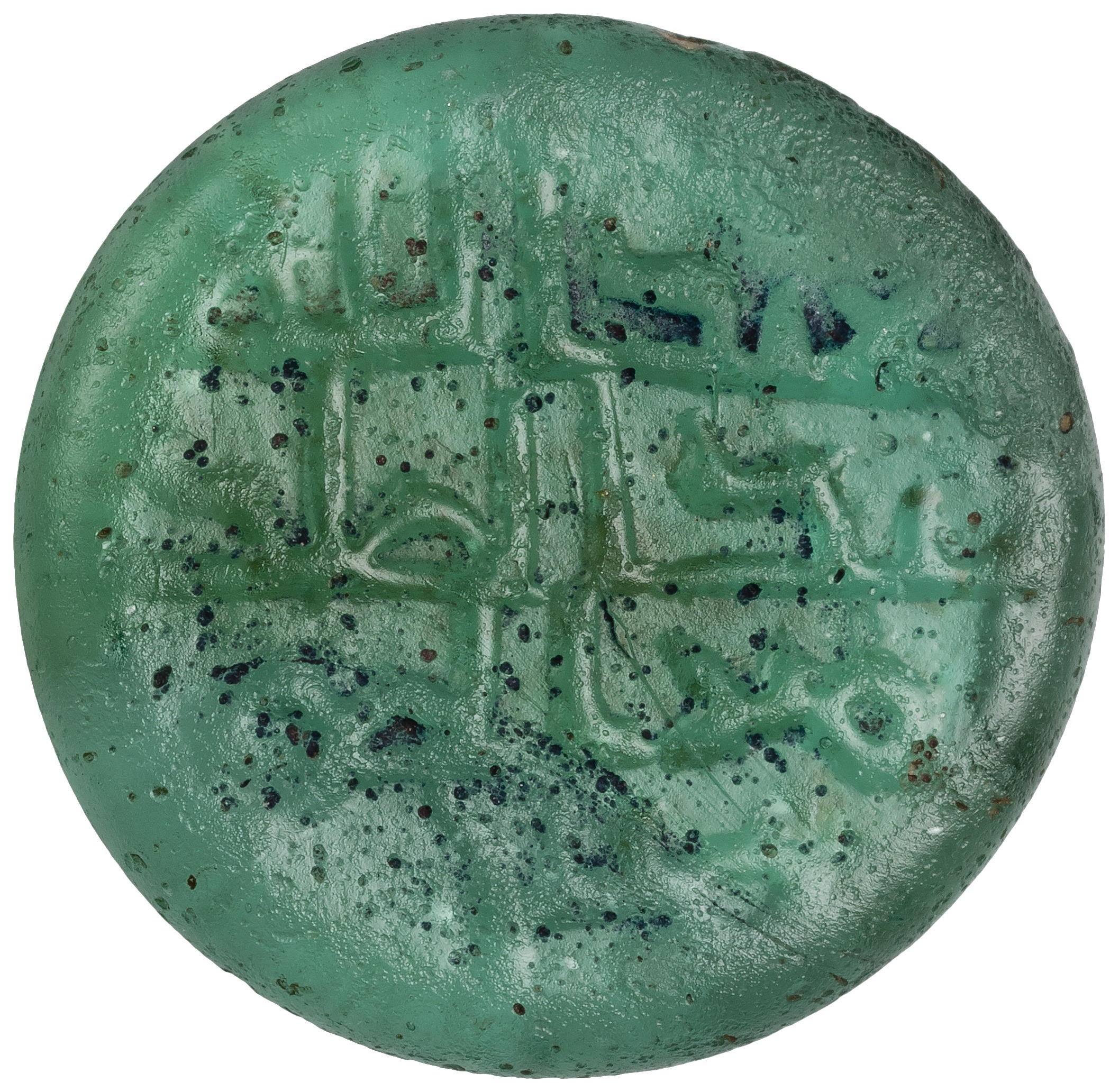「신의 종, 압드 알말리크, 신도의 장」의 명문이 새겨진 다마스쿠스에서 제작된 유리제 coin weights (동전의 무게를 재는 추)