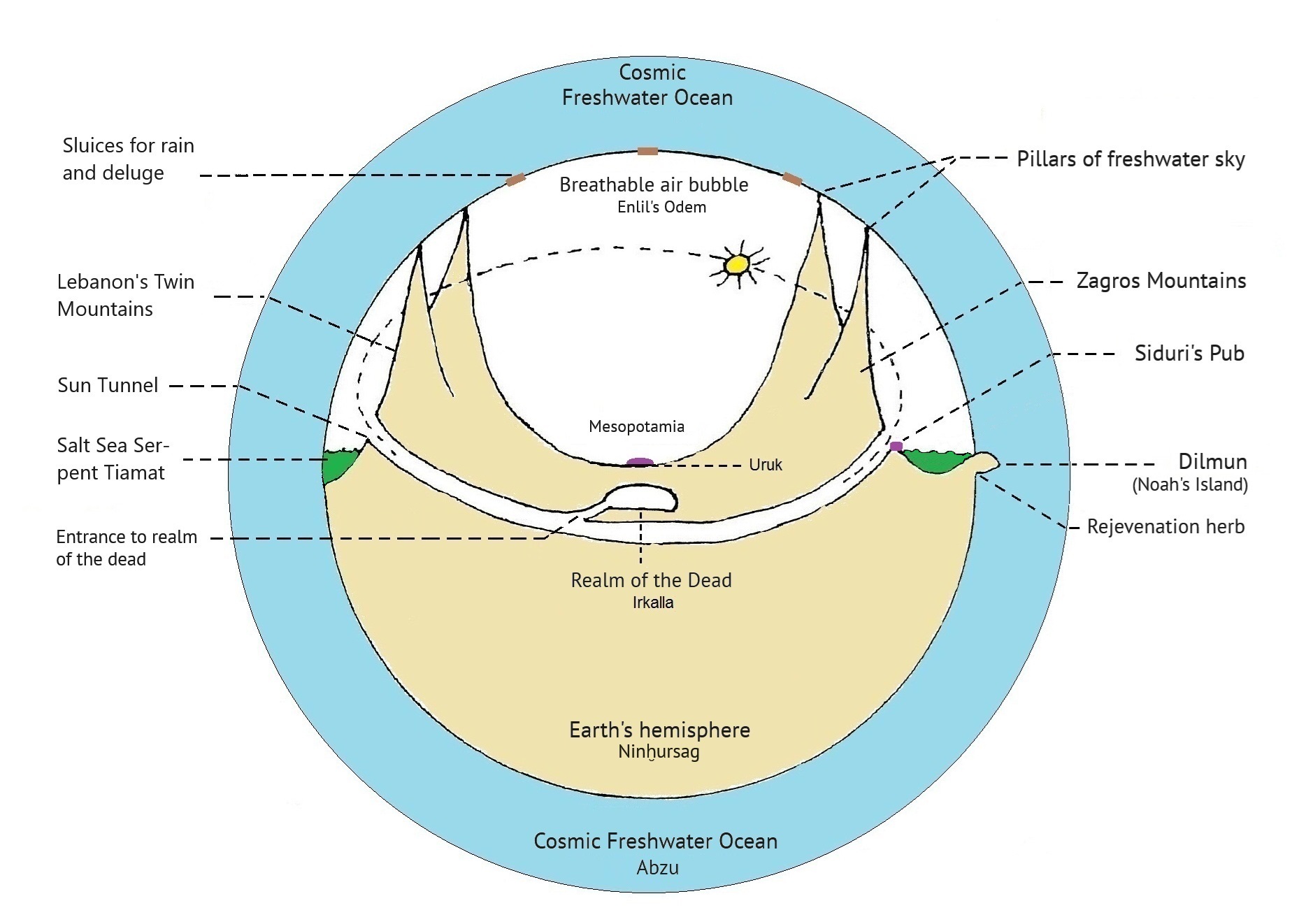 이들의 결합으로 엔키, 엔릴, 아누 등 젊은 신들이 탄생했다. 이들은 ''운명의 서판''을 바탕으로 농업을 통해 메소포타미아를 비옥하게 만들었으나, 분쟁이 발생하여 최초의 인간을 창조해 갈등을 해결했다. 인간이 번성하며 소음이 심해지자, 신들은 대홍수를 일으켜 인간을 파괴하려 했다. 이에 분노한 티아마트는 전쟁을 벌였으나, 마르두크가 티아마트를 죽이고 그녀의 시체로 하늘과 땅을 만들었다.