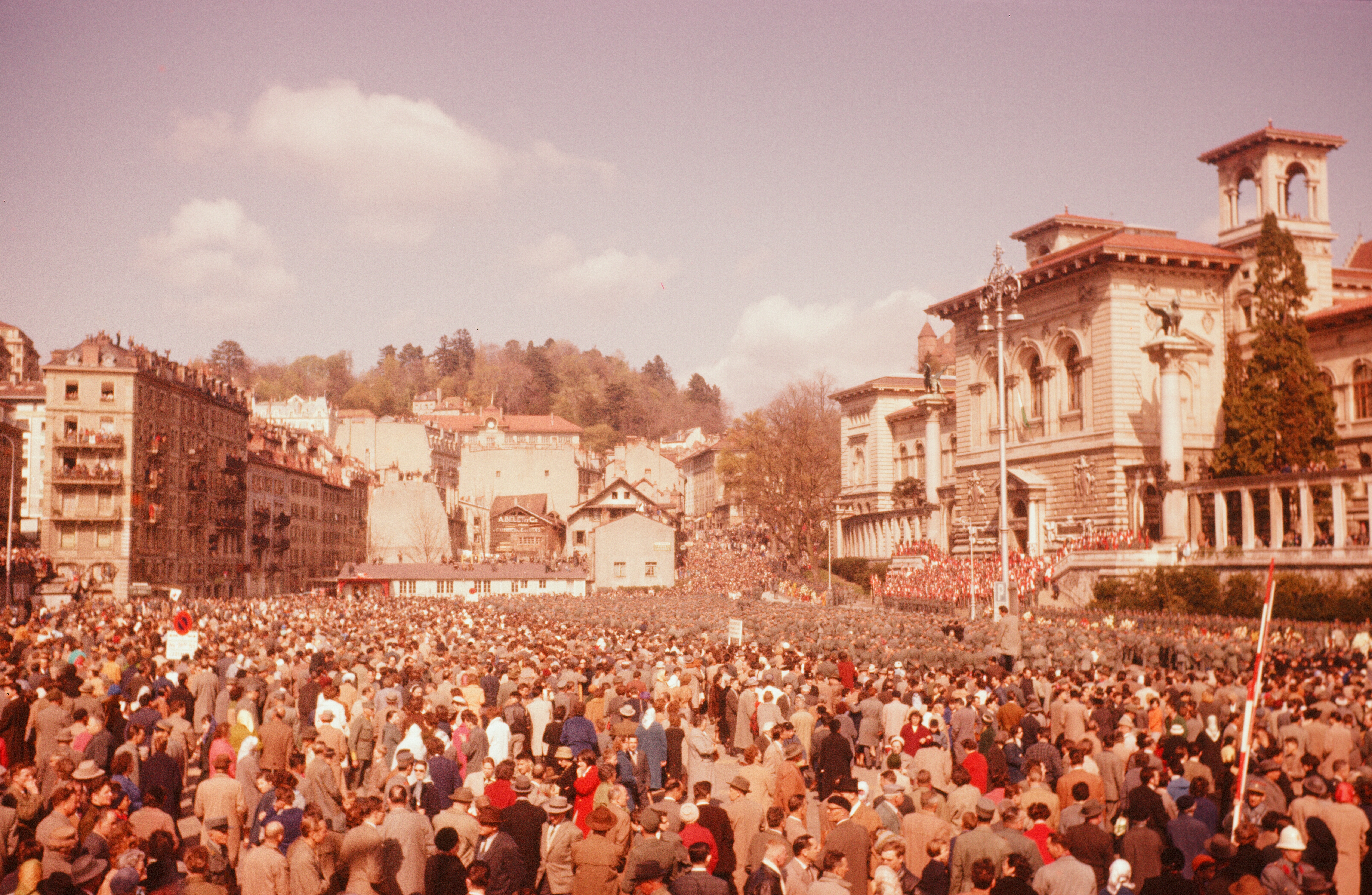 1960년 4월 12일 기장의 장례 행렬 중 로잔의 리폰 광장에 모인 군중들