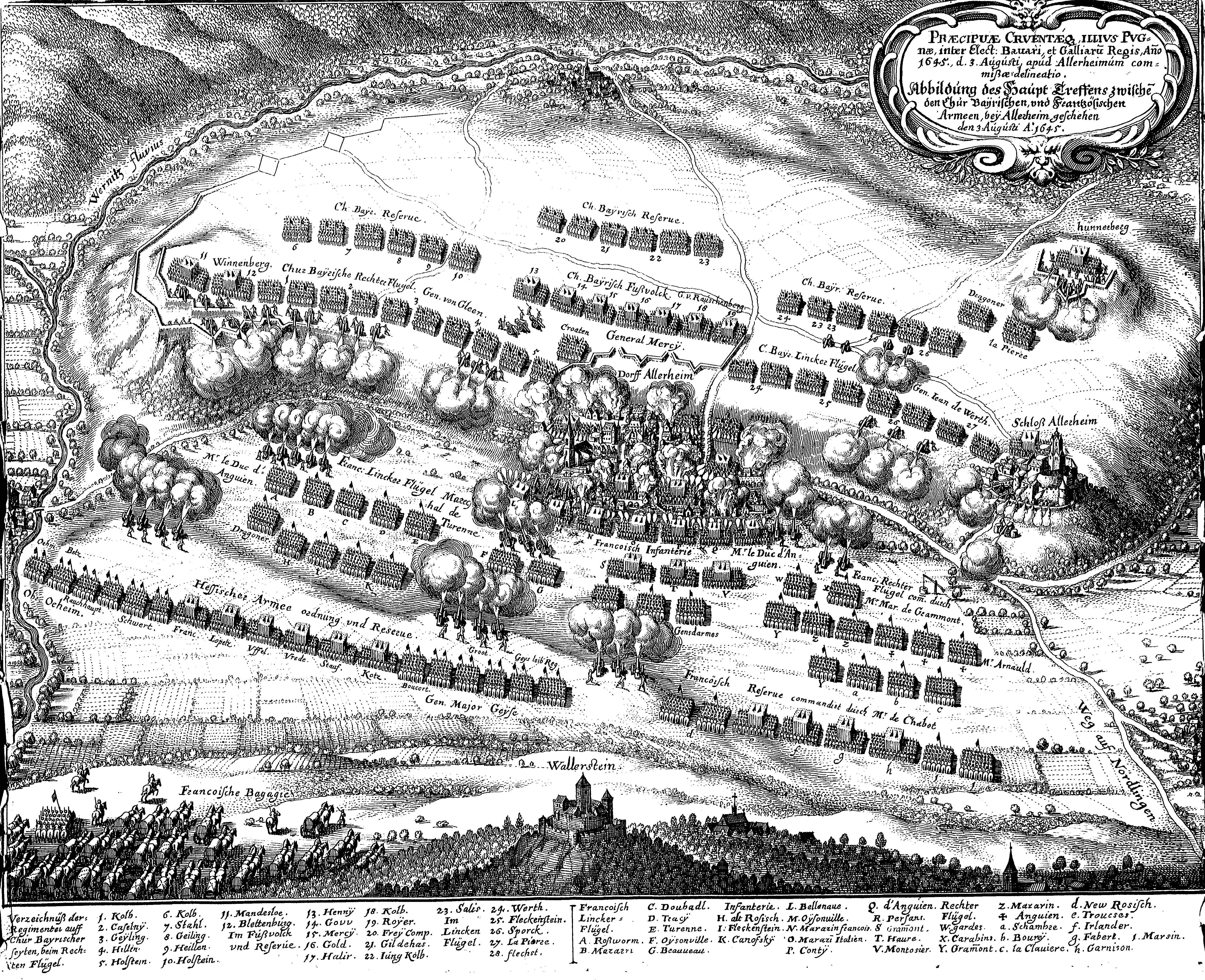 30년 전쟁을 종결시킨 4개의 유명한 전투가 있었다. 1644년 8월의 격렬했던 프라이부르크 전투(상대는 프란츠 폰 메르시가 지휘하는 바이에른군)는 프랑스가 필리프스부르크 포위전에서 승리를 거둔 후 벌인 최초 원정에서 일어난 첫 번째 전투였다. 항복시키기 전 앙기앵 공작은 철수하고 지휘를 튀렌에게 맡겼다. 튀렌 원수는 확고하게 전방으로 이동하여 1645년 원정을 전개하자 메르시는 이에 놀라 5월 2일 마리엔탈 전투에서 튀렌군을 물리쳤다.[2]