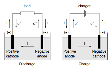 - 이차 전지: 충전과 방전이 모두 가능한 전지로, 애노드의 역할과 극성은 충전 시(양극)와 방전 시(음극)에 따라 바뀐다. 혼란을 피하기 위해 방전 시의 음극을 애노드로 통칭하기도 한다.[9][10]