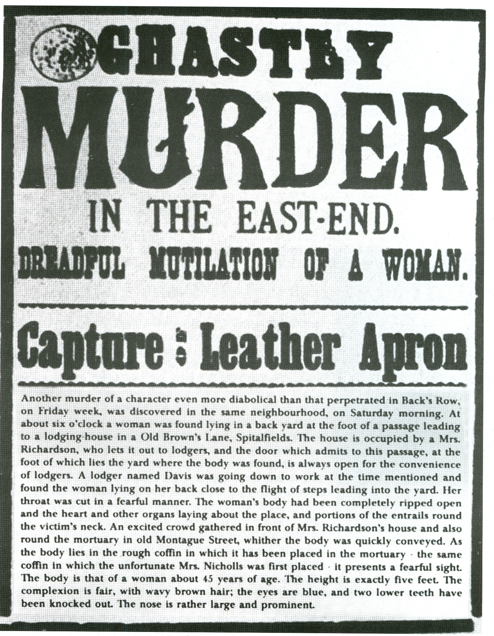 언론인들은 형사 수사부가 수사의 많은 세부 사항을 대중에게 공개하는 것을 꺼리고, 화이트채플 살인 사건에 대한 증가하는 대중의 불안을 이용하려는 열망으로 인해, 의심스러운 진실성의 기사를 자주 썼다.[94] 가혹한 유대인 고정관념을 사용하여 "가죽 앞치마"에 대한 상상력 넘치는 묘사가 언론에 나타났다.[96] ''맨체스터 가디언''은 "경찰이 어떤 정보를 가지고 있든 간에, 그들은 그것을 비밀로 유지하는 것이 필요하다고 생각한다... 그들의 관심은 특히 '가죽 앞치마'로 알려진 악명 높은 인물에게 향하고 있다고 믿어진다."라고 보도했다.[97] 경쟁 언론인들은 이러한 설명을 "기자의 상상의 신화적인 산물"이라고 일축했다.[98][99]