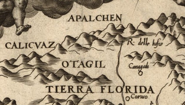 에르난도 데 소토의 1540년 탐험 이후, 스페인 지도 제작자들은 이 부족의 이름을 산맥 자체에 적용하기 시작했다. ''Apalchen''이 지도에 처음 등장한 것은 디에고 구티에레스의 1562년 지도였으며, 산맥에 대한 최초의 사용은 자크 르 모인 드 모르그의 1565년 지도였다.[12]