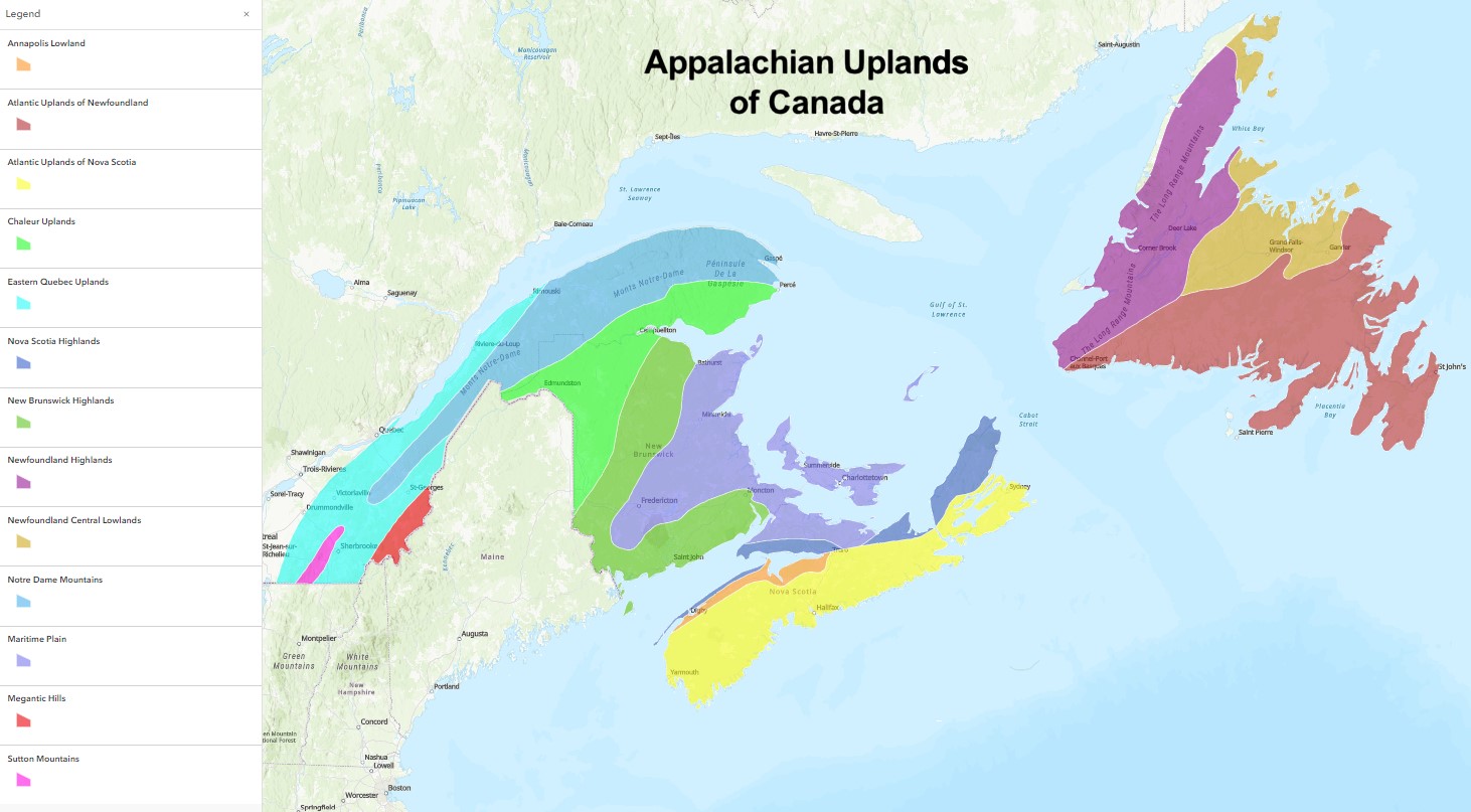 애팔래치아 고원은 캐나다의 7개 지형 구분 중 하나이다. 캐나다 지질조사소(GSC)는 미국 지질조사소(USGS)와 같은 분류 시스템을 하위 구역에서 사용하지 않는다. GSC는 캐나다의 4개 주에 걸쳐 있는 애팔래치아 고원을 13개의 하위 구역으로 나눈다.[17]