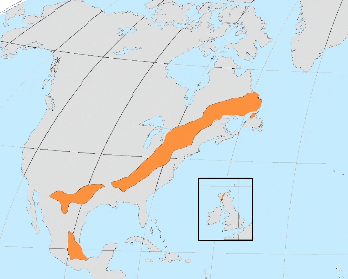 위치 | 뉴펀들랜드 래브라도주, 생피에르 미클롱, 퀘벡주, 노바스코샤주, 뉴브런즈윅주, 메인주, 뉴햄프셔주, 버몬트주, 매사추세츠주, 코네티컷주, 뉴욕주, 뉴저지주, 펜실베이니아주, 메릴랜드주, 워싱턴 D.C., 델라웨어주, 버지니아주, 웨스트버지니아주, 오하이오주, 켄터키주, 테네시주, 노스캐롤라이나주, 사우스캐롤라이나주, 조지아주, 앨라배마주 |
