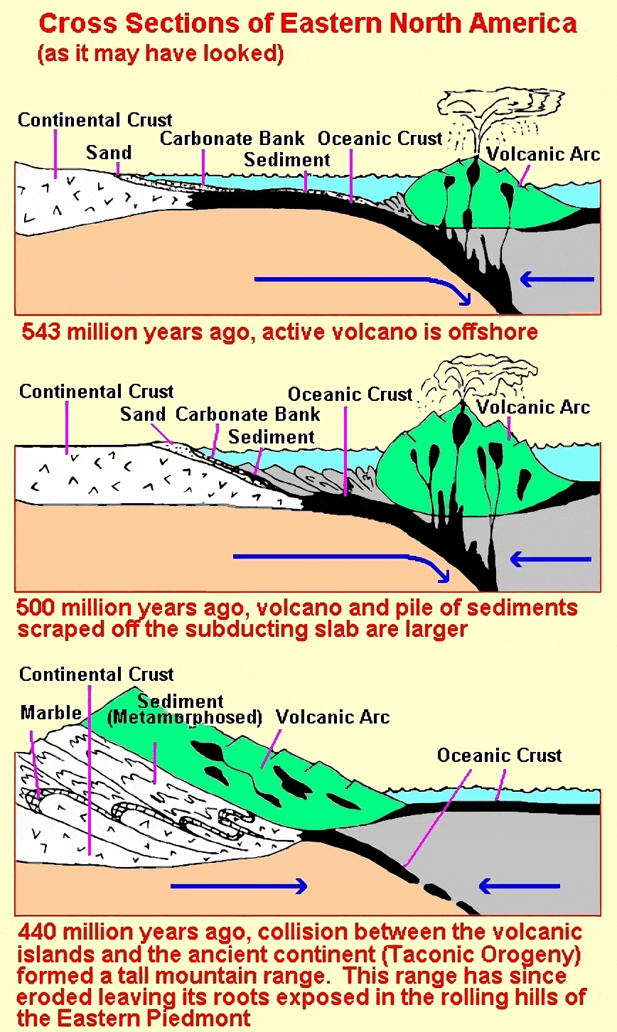 이러한 대륙 분열 동안, 약 6억 년에서 5억 6천만 년 전, 화산 활동이 지구조 경계선을 따라 나타났다. 오늘날의 블루 리지 산맥에서 이러한 활동의 증거를 찾을 수 있다. 로저스 산, 화이트탑 산, 파인 산은 모두 이 시기에 발생한 화산 활동의 결과이다.[23] 지하 활동의 증거, 즉 상부 암석에 관입된 암맥과 암상도 블루 리지에 존재한다. 예를 들어, 변성암은 버지니아 주 몽고메리 카운티의 중앙 블루 리지 지역에 있는 프라이스 단층을 따라 발견되었다.[24]