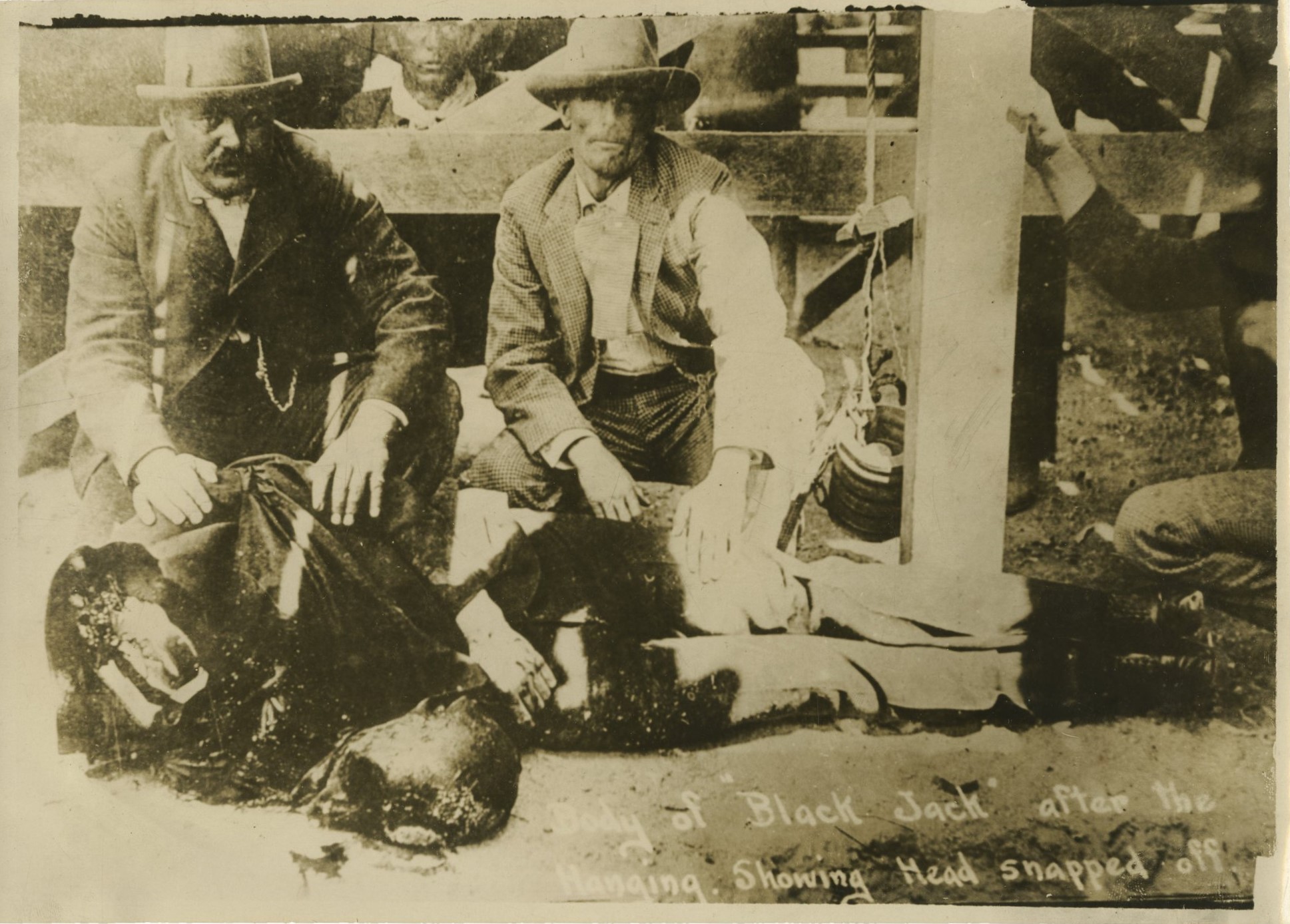 1901년 엽서에 실린 사진으로, 실패한 장대형 교수형으로 톰 케첨의 시신이 참수된 모습이 담겨 있다. 캡션에는 "목이 부러진 후의 잭 블랙의 시신"이라고 적혀 있다.