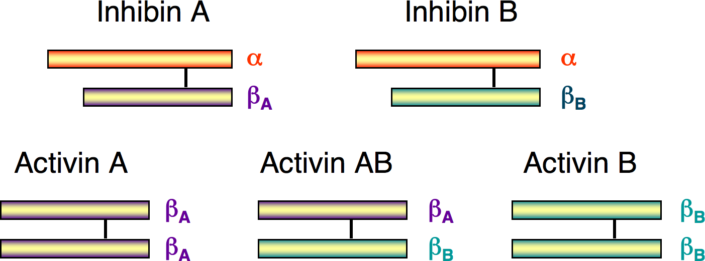 액티빈과 인히빈 단백질 복합체는 모두 이량체 구조이며, 각 복합체에서 두 개의 단량체는 단일 이황화 결합으로 서로 연결되어 있다.[9] 또한, 두 복합체 모두 관련된 유전자와 단백질의 동일한 계열에서 파생되었지만, 서브유닛 구성이 다르다.[7]