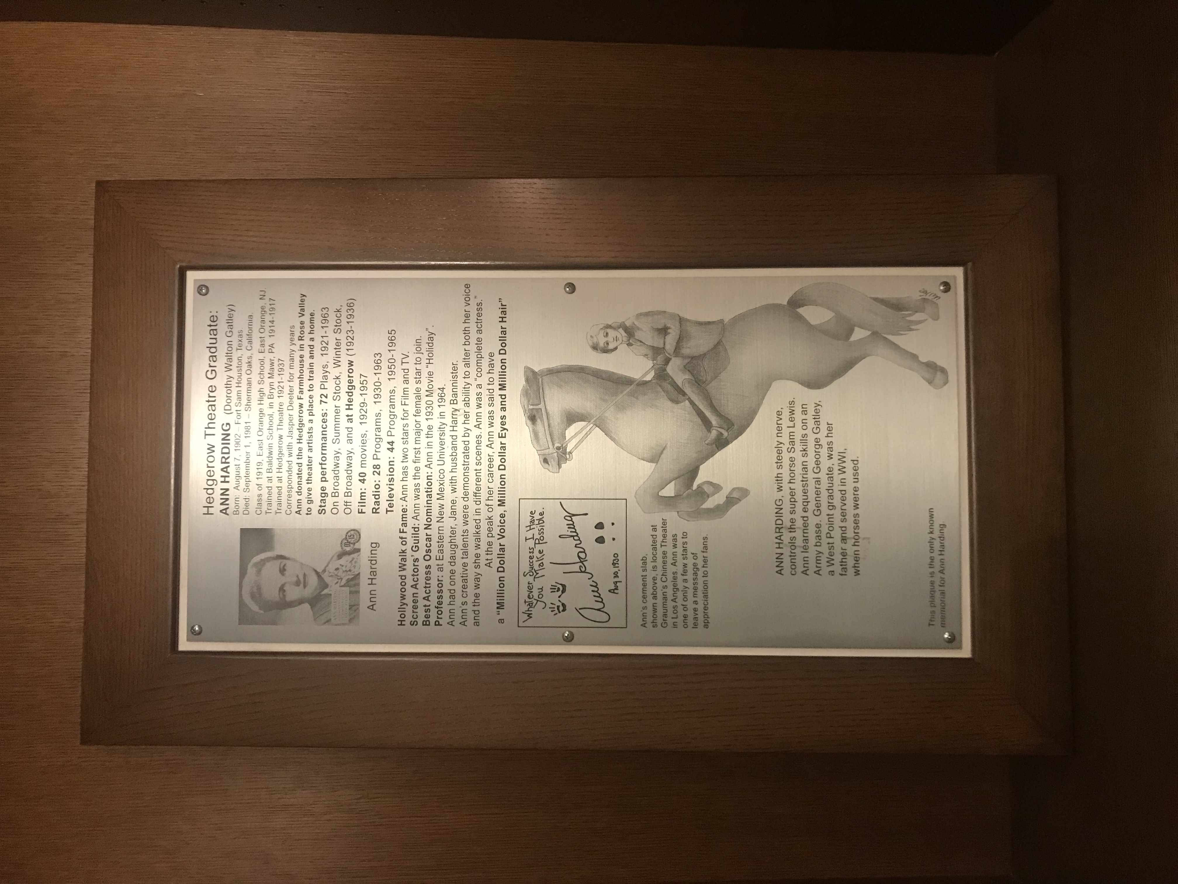 2023년 10월 7일 현재, 헤지로우 극장 내부에 앤 하딩을 기리는 명판이 있다.