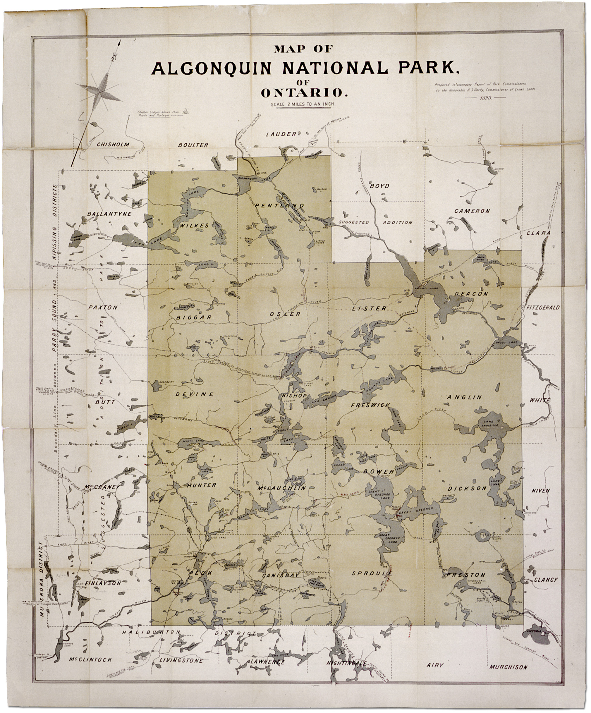 이러한 상충되는 이해관계를 관리하기 위해 온타리오 정부는 이 문제를 조사하고 보고할 위원회를 임명했다.[1] 앨곤퀸 공원 설립 법안은 1892년 알렉산더 커크우드(위원장 및 왕실 토지 위원), 제임스 딕슨(온타리오 토지 측량사), 아치볼드 블루(광산 국장), 로버트 핍스(산림부장), 오브리 화이트(왕실 토지 부위원장)로 구성된 5명의 왕립 위원회에 의해 작성되었다.[1] 이 위원회는 머스코카, 리틀 마다와스카 강(오페옹고 포함), 아메이블 뒤 퐁, 페타와와, 사우스 강 등 다섯 개의 주요 강 수원지 부근에 있는 영토에 공원을 설립할 것을 권고했다.[1]