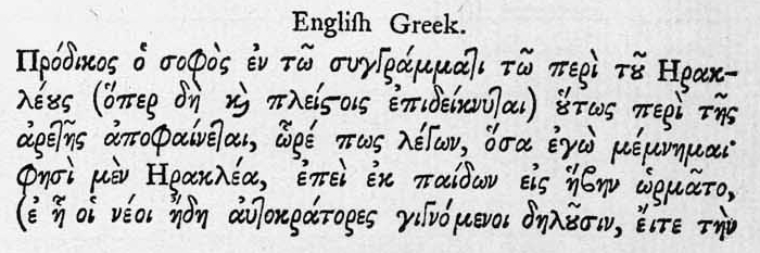 두 번째 줄에 ϗ|카이el 사용 (18세기 그리스 문자 활자 샘플, 크세노폰의 『소크라테스의 회상』 2.1.21).