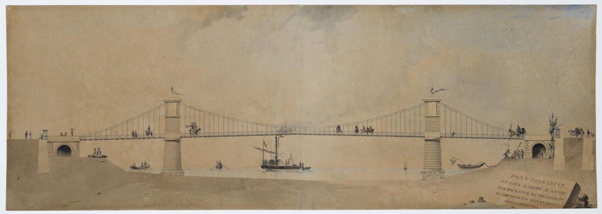 클로드 나비에는 1821년에 강 한가운데 지지대 없이 센 강을 건너는 기술적으로 혁신적인 다리를 구상했다.[1] 1824년에 건설이 시작된 이 현수교는 현재 알렉상드르 3세 다리가 있는 앵발리드 반대편에 세워질 예정이었다.[1] 그러나 나비에는 계산에 안전 여유를 두지 않았고, 다리 건설 계약은 이례적으로 엄격했다. 나비에의 계획이 사적 투자 회사에 의해 승인된 후, 시공업자는 승인 없이 변경할 수 없었고, 개선을 제안할 권한도 없었다.[1]