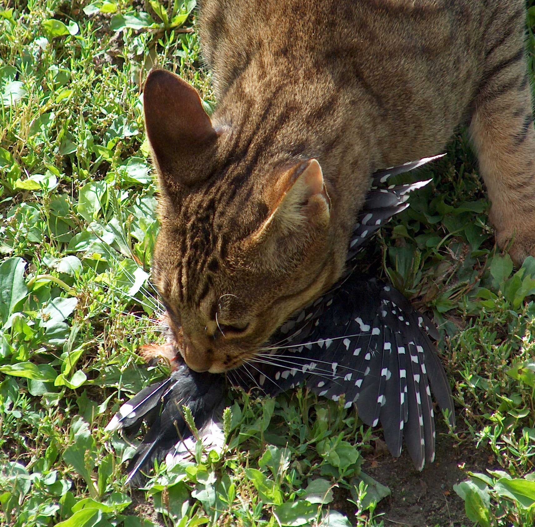 주인이 배불리 잘 먹인 집고양이도 집 밖에 풀려나면 소동물을 사냥하고 잡아먹을 수 있다.[224][225][125][126] 뉴질랜드의 카카포나 호주의 베통과 같은 토착종은 포식자에 대한 방어 수단이 없어 고양이의 포식에 취약하다.[229][130]