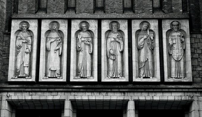 드우고슈는 ''크라코비엔 교구의 혜택의 책''에서 현재의 교회는 1446년에 형제 스타니스와프 치엘라트코(Czelanthco), 산도미에르츠 학자 및 치오우에크 문장의 미코와이 형제가 지었다고 기록하고 있는데, 이는 원래 교회가 헝가리인들에 의해 파괴되었기 때문이다.[2] 스트르제미에, 트롬비, 그리프, 야니나, 포보그의 문장이 교회의 금고에 있는데, ''지리 사전''은 이것들이 발전에 기여한 귀족 가문일 것이라고 추측한다.[2]