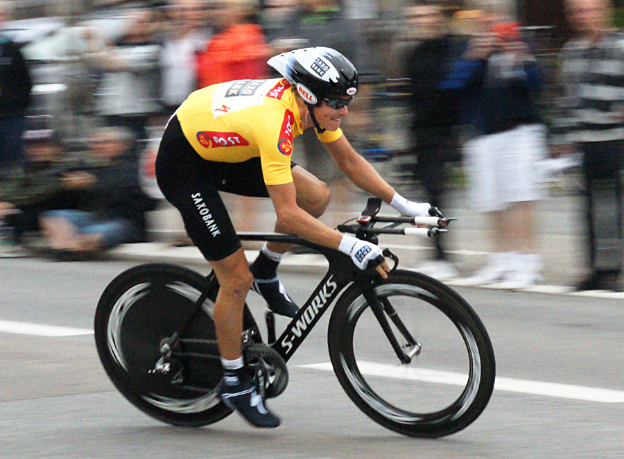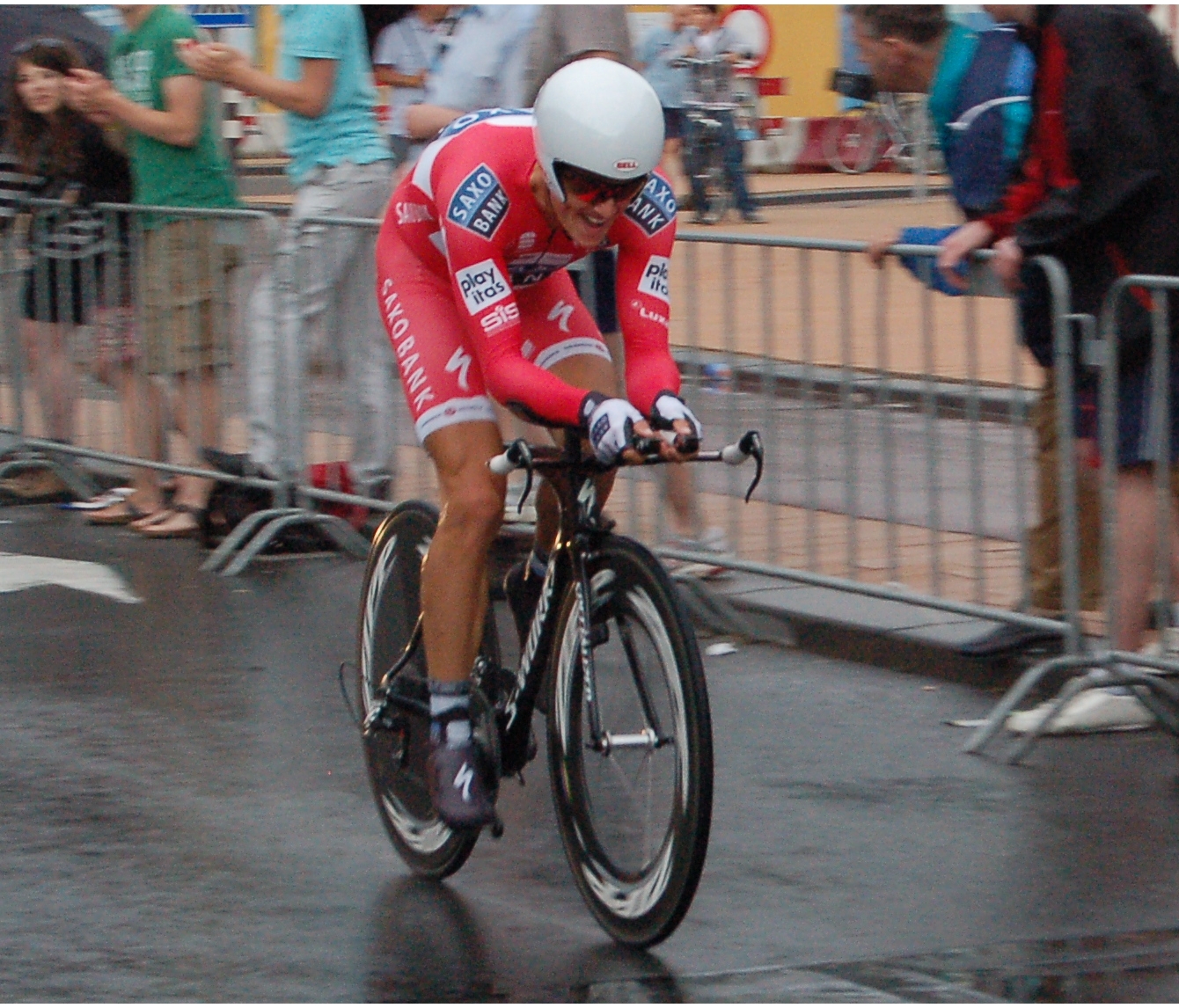 푸글상이 덴마크 내셔널 타임 트라이얼 저지를 입고 2010년 투르 드 프랑스 프롤로그를 달리는 모습