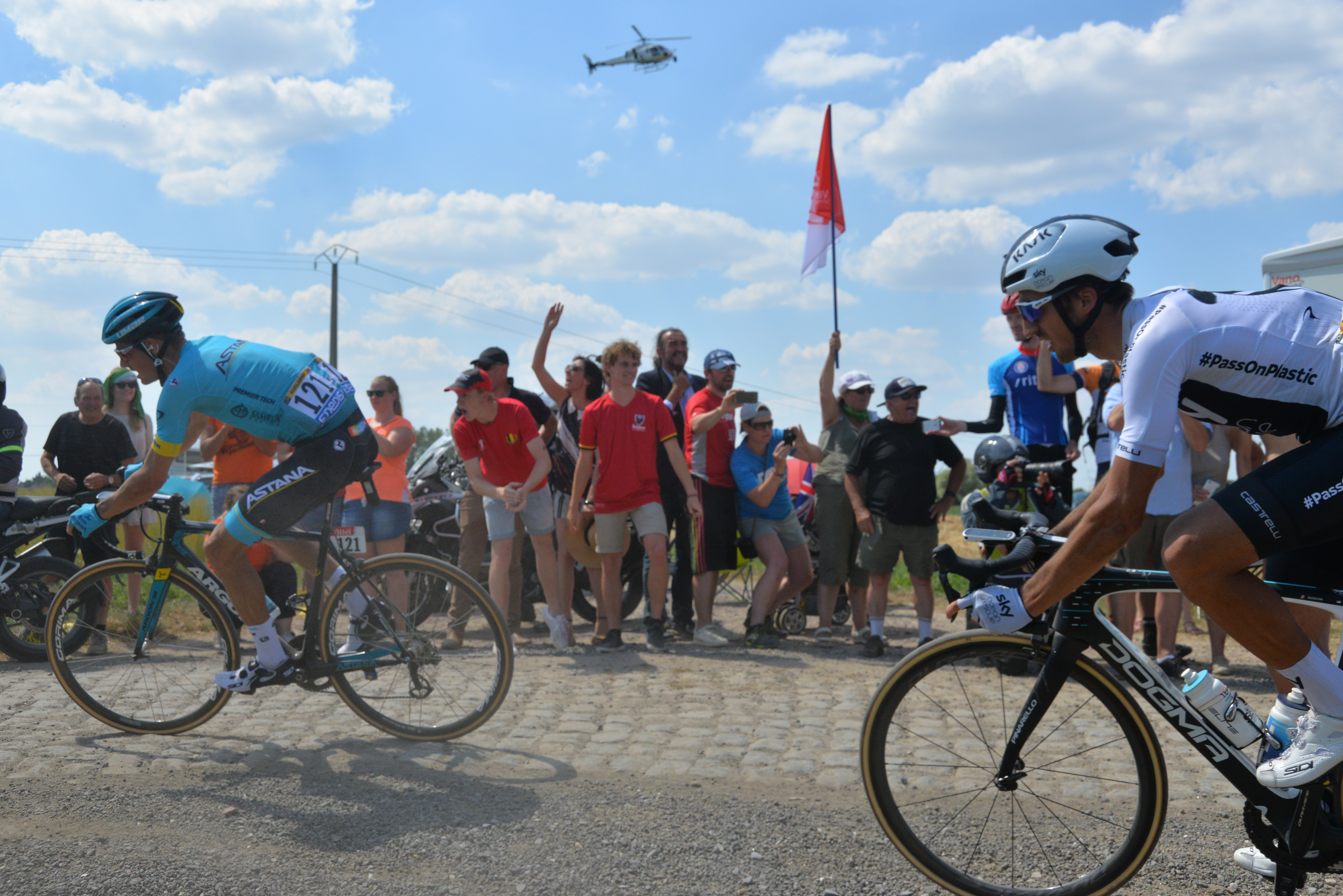 푸글상(왼쪽)은 2018년 투르 드 프랑스 9구간에서 자갈길을 달리고 있다.