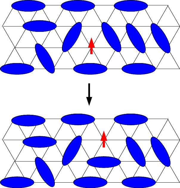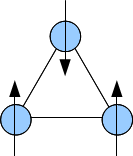 국소 스핀이 동시에 모두 만족될 수 없는 경쟁적인 교환 상호 작용이 존재하여 시스템의 바닥 상태에서 큰 축퇴를 유발하는 경우 좌절된다. 이징 스핀의 삼각형(스핀의 가능한 유일한 방향이 "위" 또는 "아래"인 경우)은 반강자성적으로 상호 작용하며 좌절의 간단한 예이다. 바닥 상태에서 스핀 2개는 반평행할 수 있지만 세 번째 스핀은 반평행할 수 없다. 이는 바닥 상태에서 스핀의 가능한 방향(이 경우 6개)을 증가시켜 변동을 강화하고 자기 정렬을 억제한다.[1]