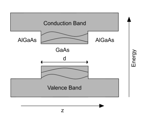 양자 우물 내부에는 캐리어가 가질 수 있는 불연속적인 에너지 고유 상태가 있다. 전도대 전자는 AlGaAs 영역보다 우물 내부에서 더 낮은 에너지를 가지므로 양자 우물에 갇힐 수 있다. 원자가대의 정공도 마찬가지로 원자가대에 생성된 퍼텐셜 우물 꼭대기에 갇힐 수 있다. 갇힌 캐리어의 상태는 상자 속 입자와 유사하다.[4]