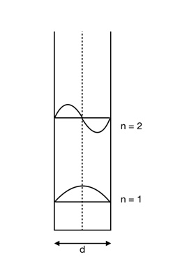 여기서 ()은 정수 양자수를 나타내며, 는 각 상태와 관련된 파수 벡터이다. 관련된 불연속 에너지는 다음과 같이 주어진다.